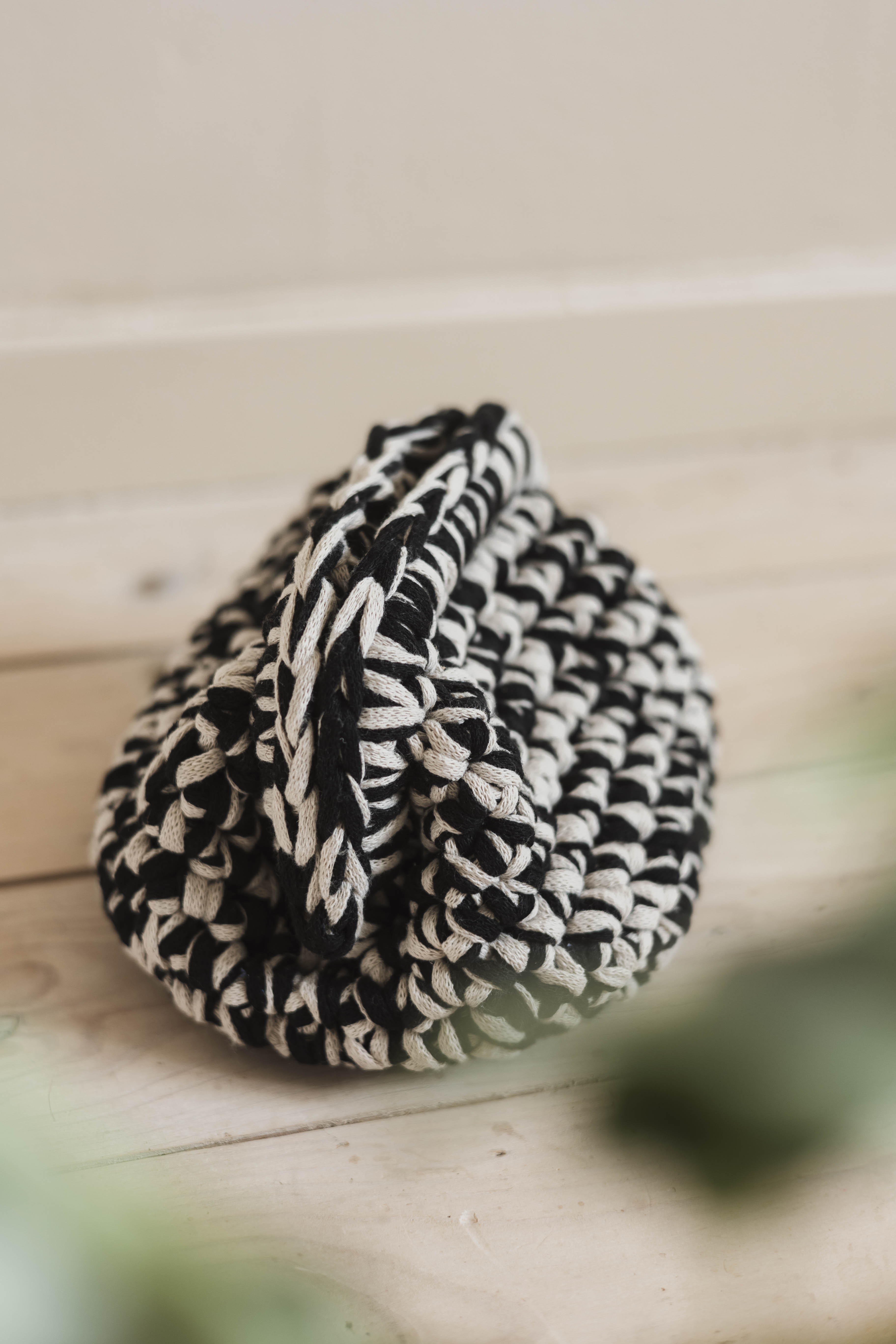 This clutch is easy to crochet and the result is beautiful, and you can make it completely unique according to your preferences. Perfect to have in your handbag with enough space for everything you need. All you need is a clutch handle (we've used 16cm), two skeins of our EKO Mini Tube yarn and a 10 mm crochet hook. We used the colors "Greige" and "Black" in the pictures. You can easily use this pattern for a larger metal clutch, but then you will need more yarn.
