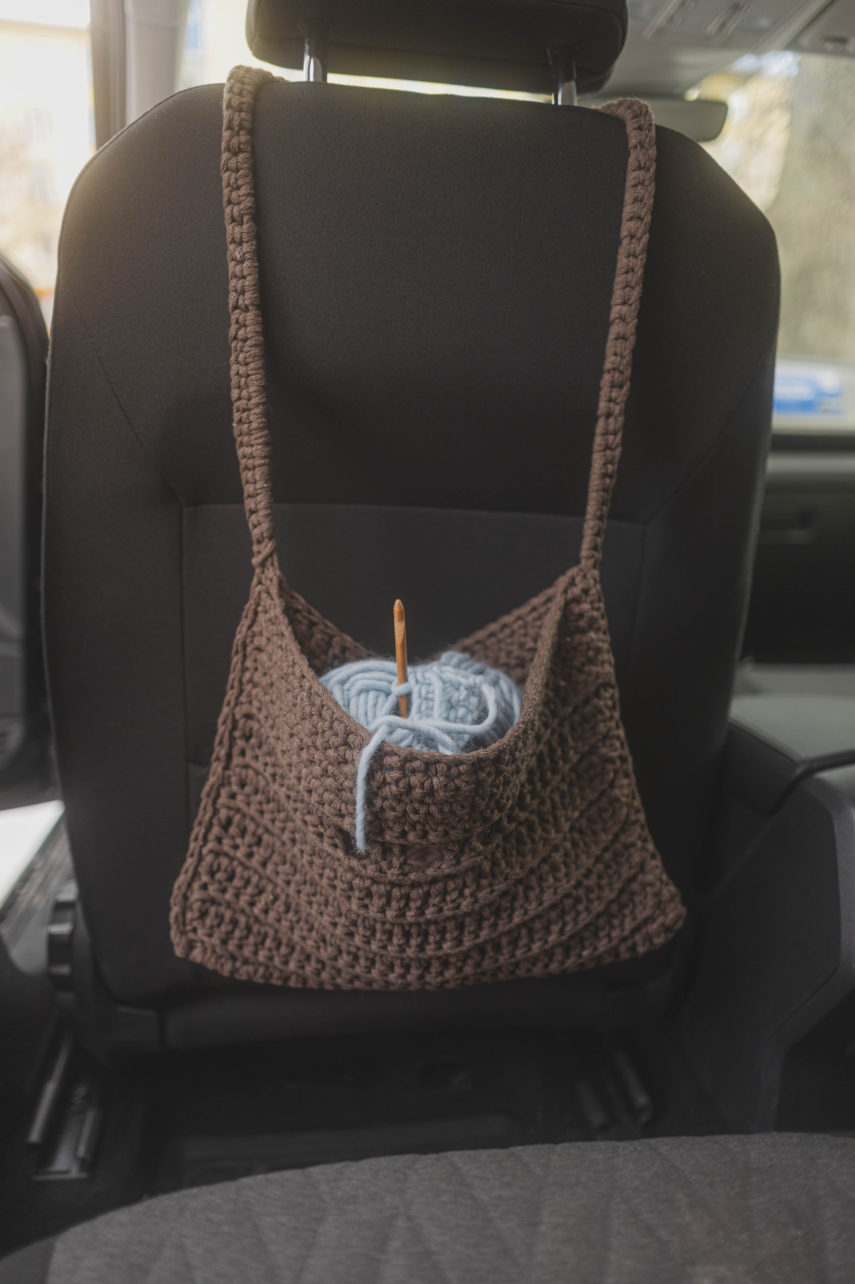 Torun is a practical crochet pattern for a smart storage bag designed for the car. The bag is easily hung over the seat, making it simple to bring your crochet or knitting project along on your journey. The hole pattern on the front allows you to pull the yarn directly from the skeins, which stay neatly in place inside the bag while you crochet or knit. The holes also make it easy to separate different skeins of yarn. In addition, there is space to store both crochet hooks and knitting needles in an easy and accessible way. You will need EKO Nano yarn, a 7 mm crochet hook, and scissors. For reference, we used the color “Cacao. The finished hanging organizer measures approximately 24 × 34 cm.