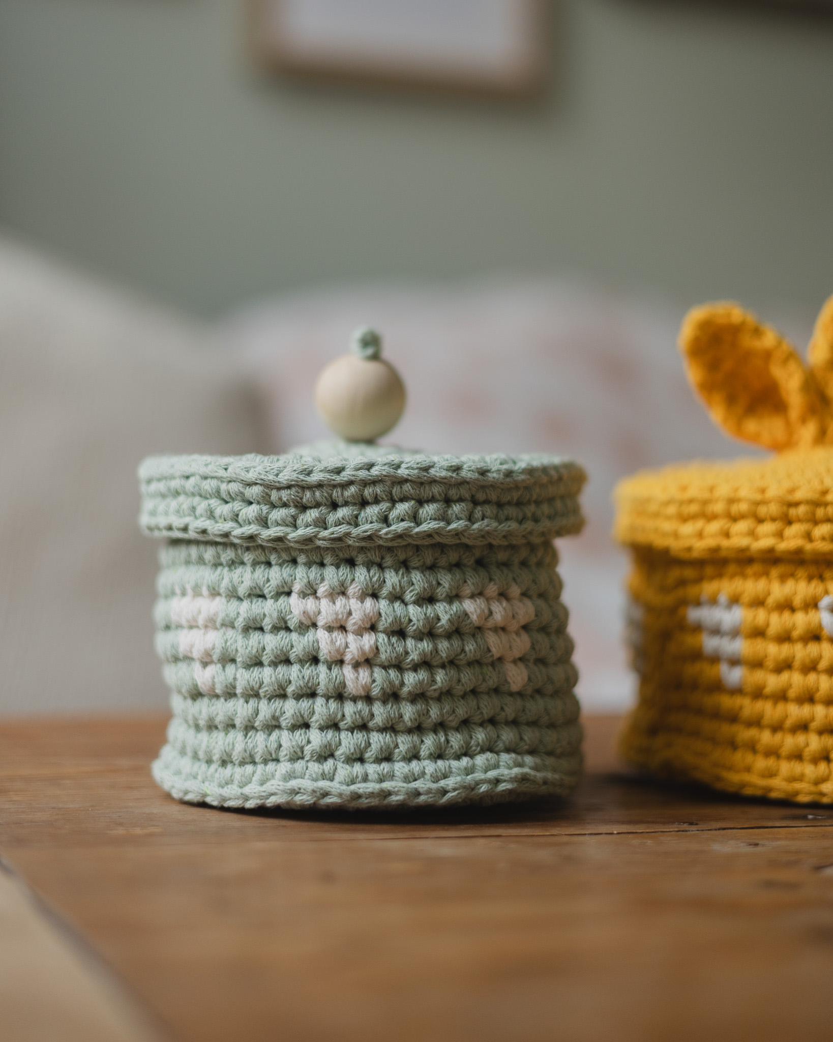 Then weave in all ends. On the green basket lid, attach a wooden knob, and on the yellow basket lid, add the bunny ears.