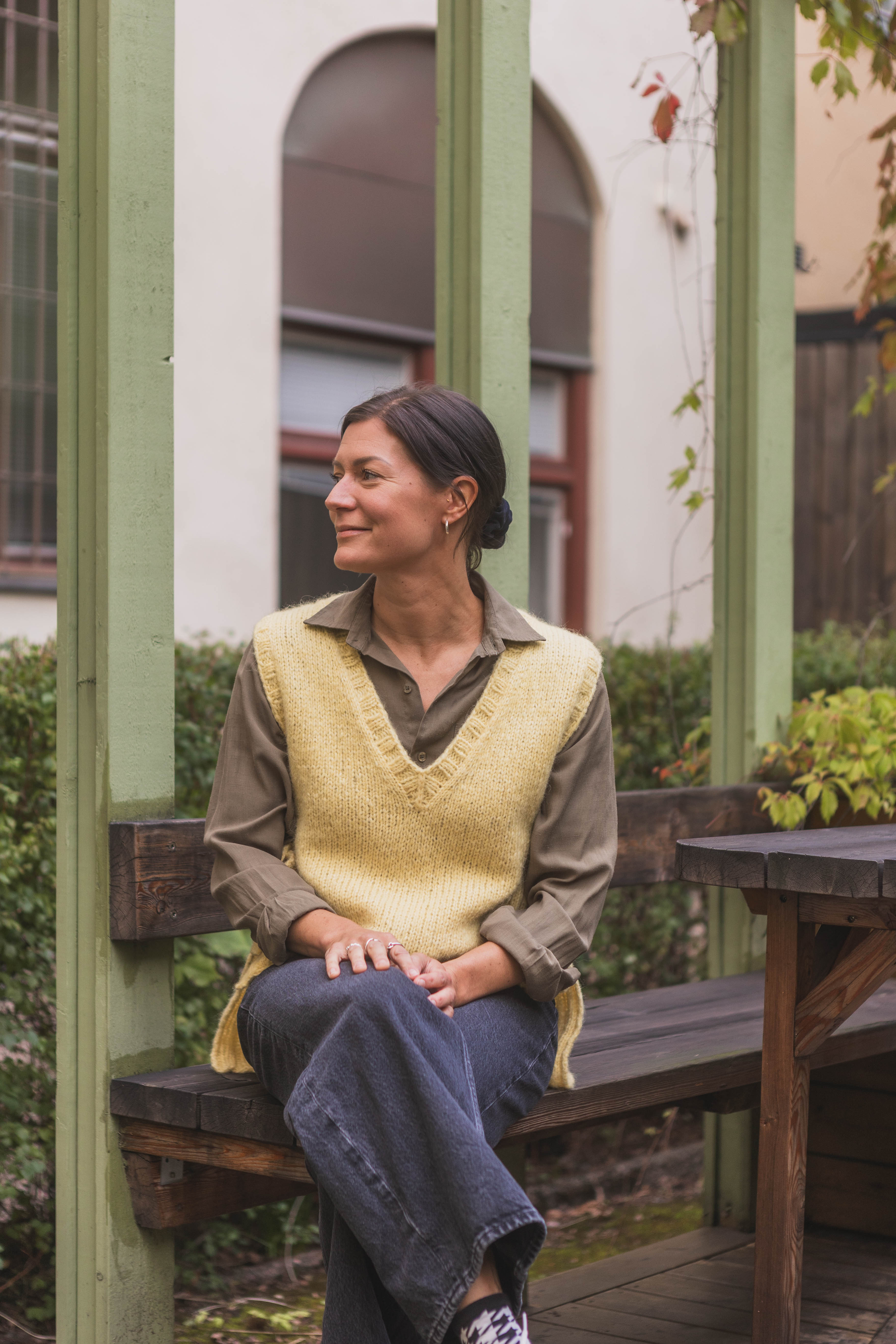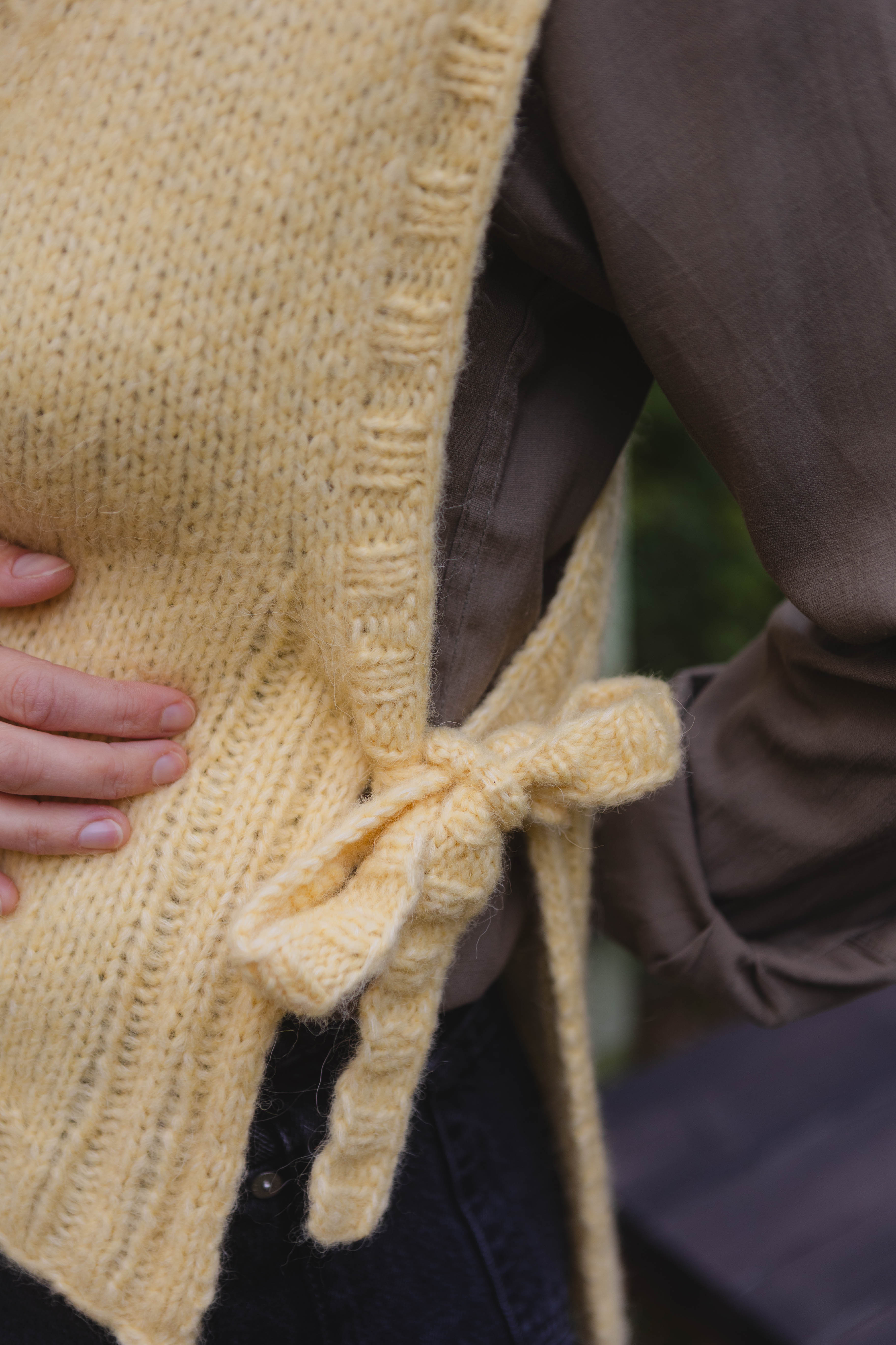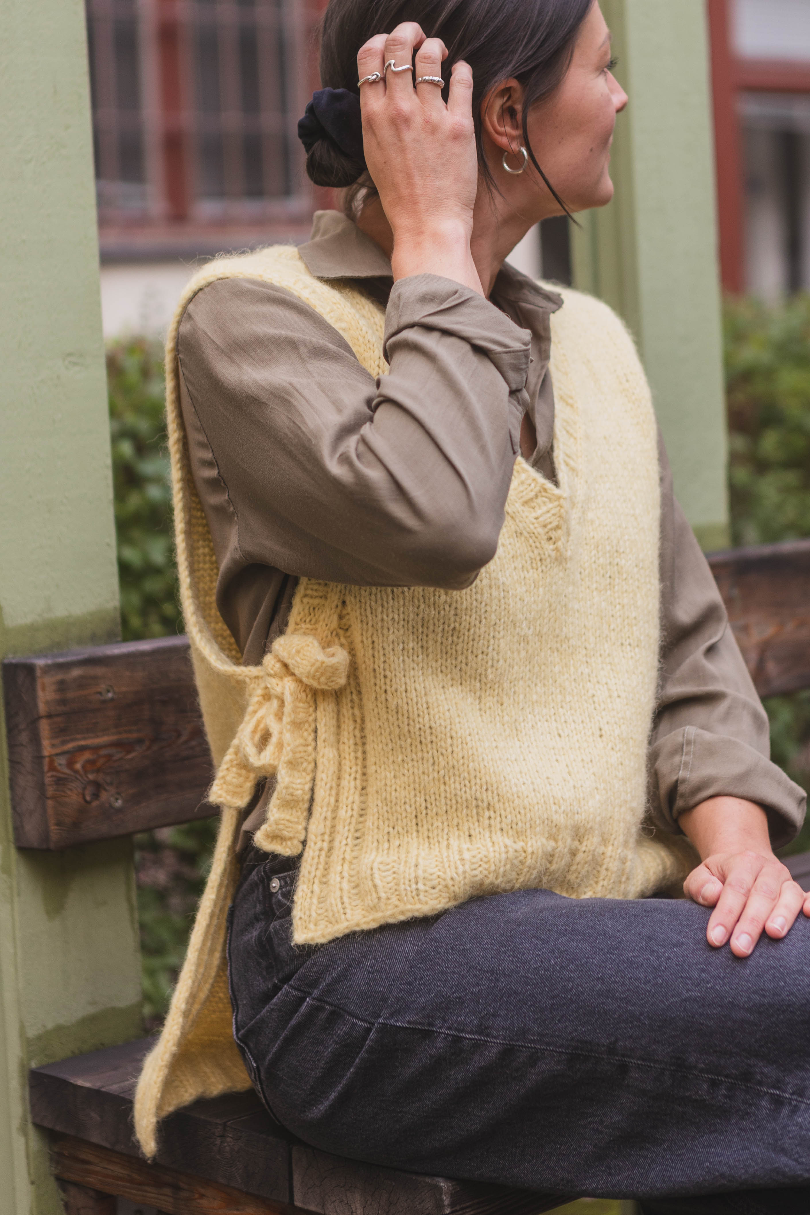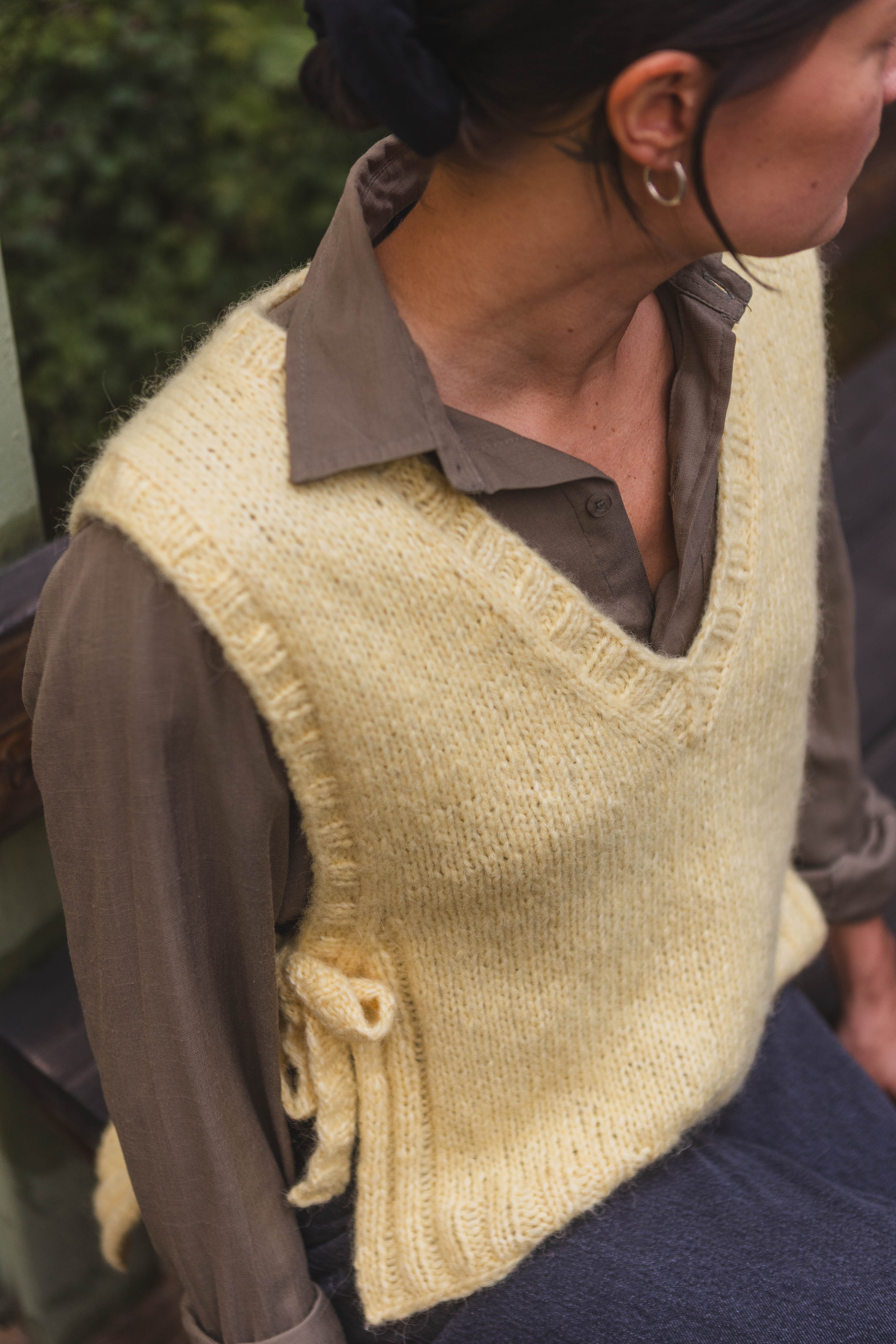 The slipover is knit back and forth, starting with the back piece from the bottom up. Short rows are used to shape the shoulder slope, but you can skip this step if it feels difficult or complicated. Once the back is finished, the work is divided, and the front pieces are knit separately until the neckline shaping is done. Then the front pieces are joined and finished with a ribbed hem. Stitches are picked up around the neckline to knit a ribbed neckband. Stitches are also picked up along the armholes, where ribbing is knit simultaneously with the tie bands.