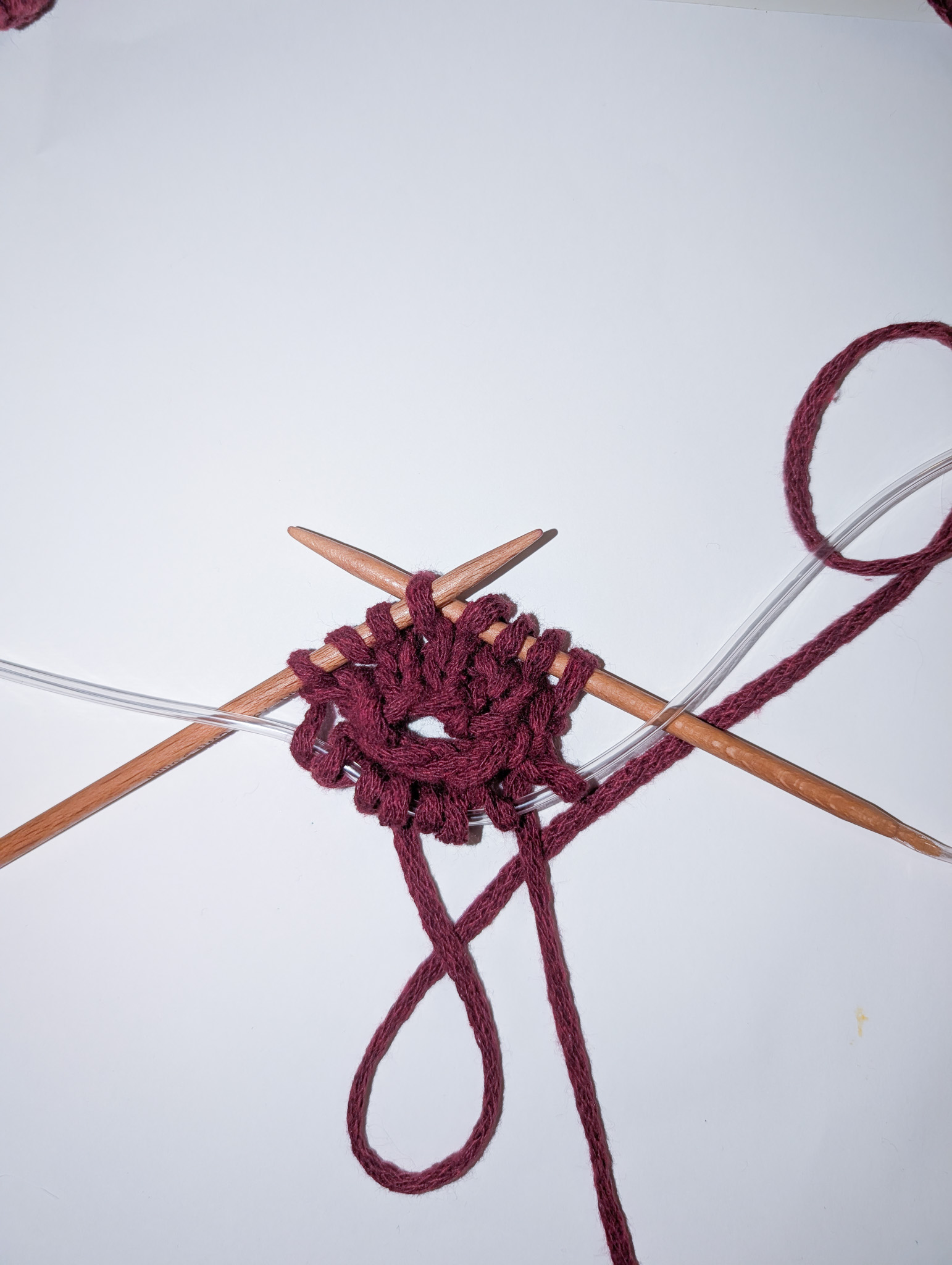As your work grows, the cable may become too short to use the magic loop comfortably. If that happens, place a stitch marker at the beginning of the round and knit in the round as usual.