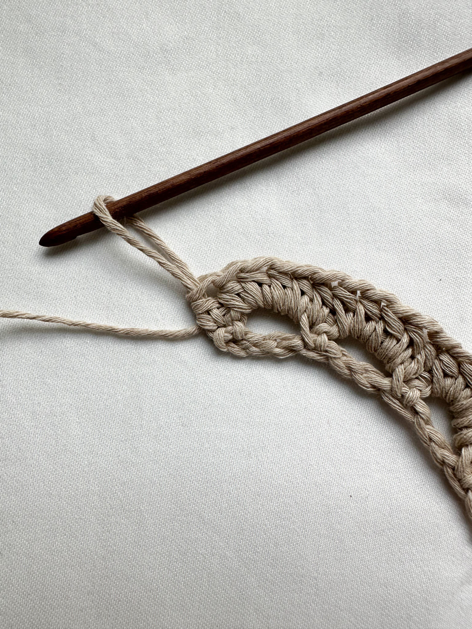 Next, chain 4, skip 2 stitches, and make 1 sc in the next stitch — you’ve now created a chain space. Chain 4 again, skip 2 stitches, and make 1 sc — another arch is formed.