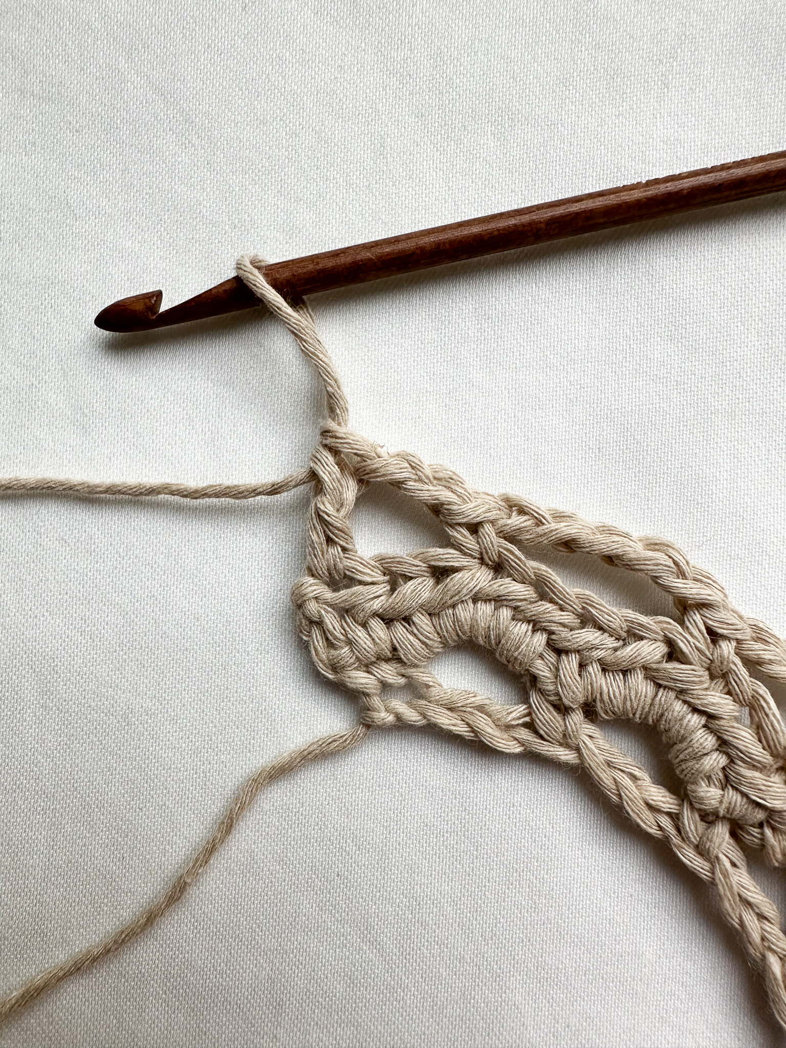 Row 5: 1 sc, *6 ch, skip 5, 1 sc* × 14/20 (14/20 arches). Ch 2, turn.