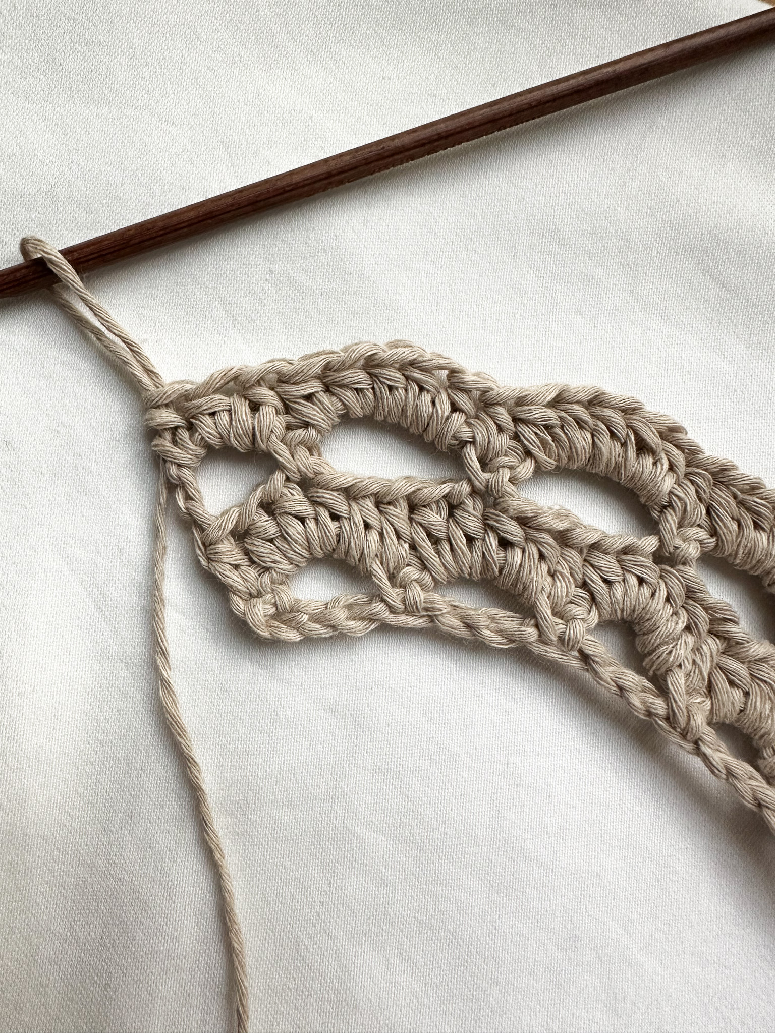 Repeat this pattern so you have 13/19 arches in total.Chain 4, skip 2 stitches, and finish with a dc in the last stitch – this forms the second half-arch. After row 7, you should have 2 half-arches and 3/19 full arches.