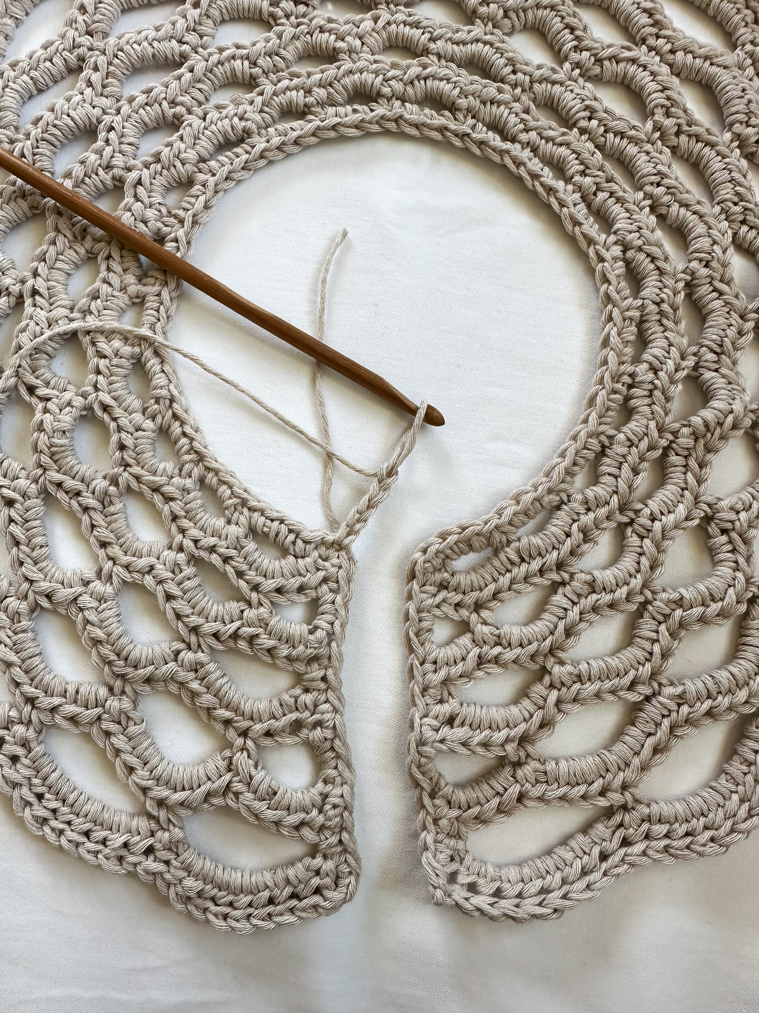 Work slip stitches along all arches. At the last stitch, make 2 single crochet in the corner, then continue with single crochet along the edge at the collar opening. Make 2 single crochet in the top corner, then continue with 3 single crochet per arch around the chain stitches at the neckline. Repeat with 2 single crochet in the opposite corner, and finish with single crochet along the other edge of the collar opening.