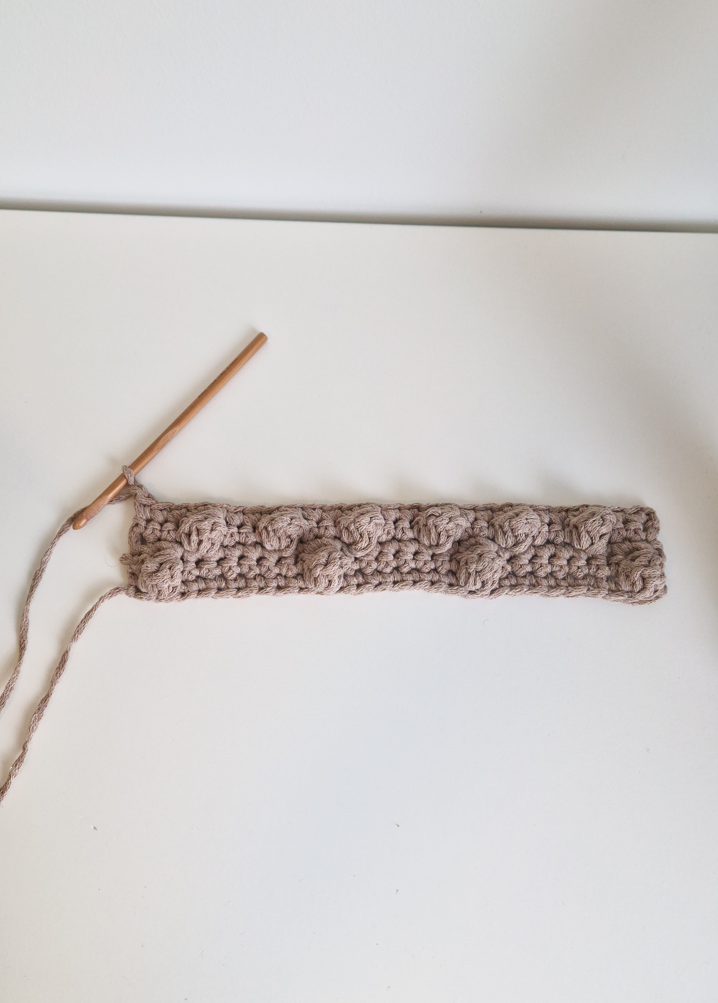 Row 5: *Crochet 3 single crochets, then 1 bobble stitch*. Repeat what’s inside the *...* a total of six times. Then crochet 3 single crochets. Chain 1 and turn your work. You should have 27 stitches in total.