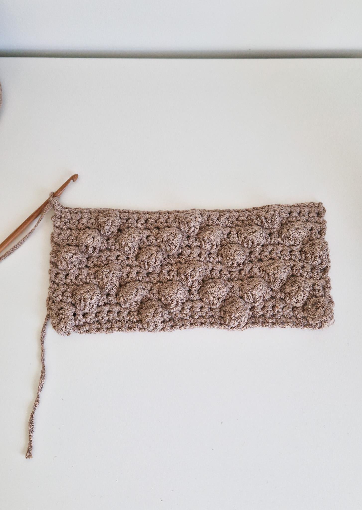 Row 7: Crochet 5 single crochets. *Crochet 1 bobble stitch, then 7 single crochets*. Repeat what’s inside the *...* a total of two times. Then crochet 1 bobble stitch and 5 single crochets. Chain 1 and turn your work. You should have 27 stitches in total.