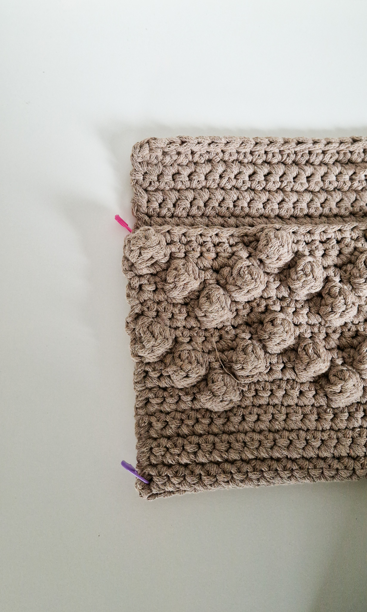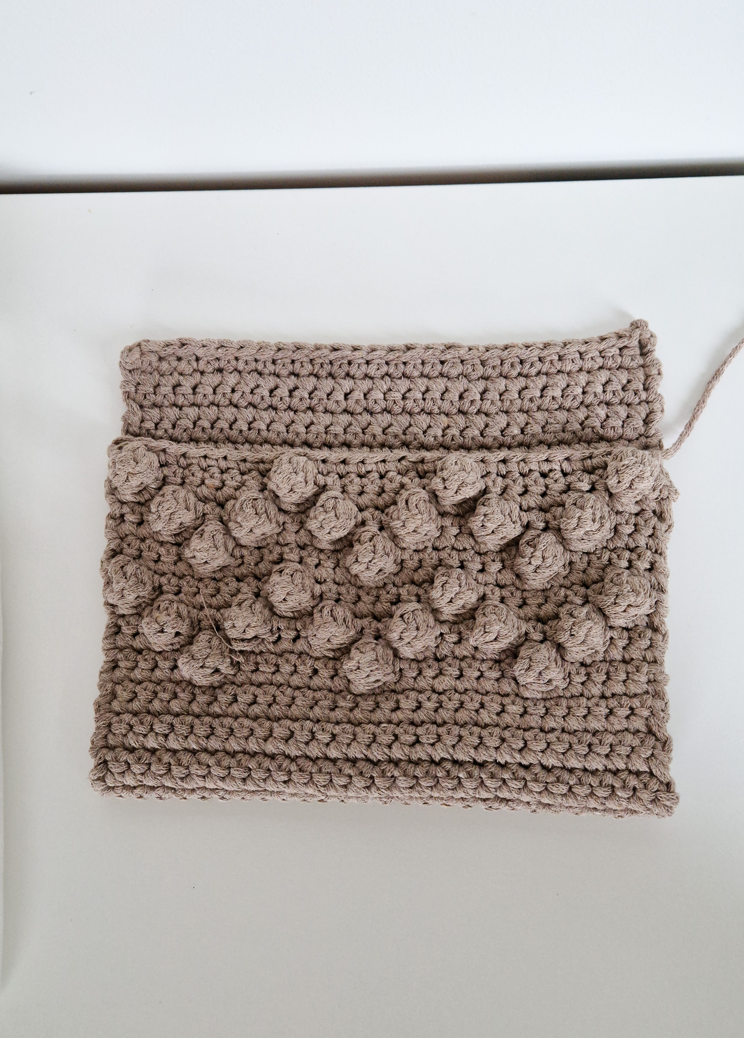 Fold your pocket as you prefer. I chose to have the pretty bobble section about 6–7 rows down from the top, but of course, this is up to you.