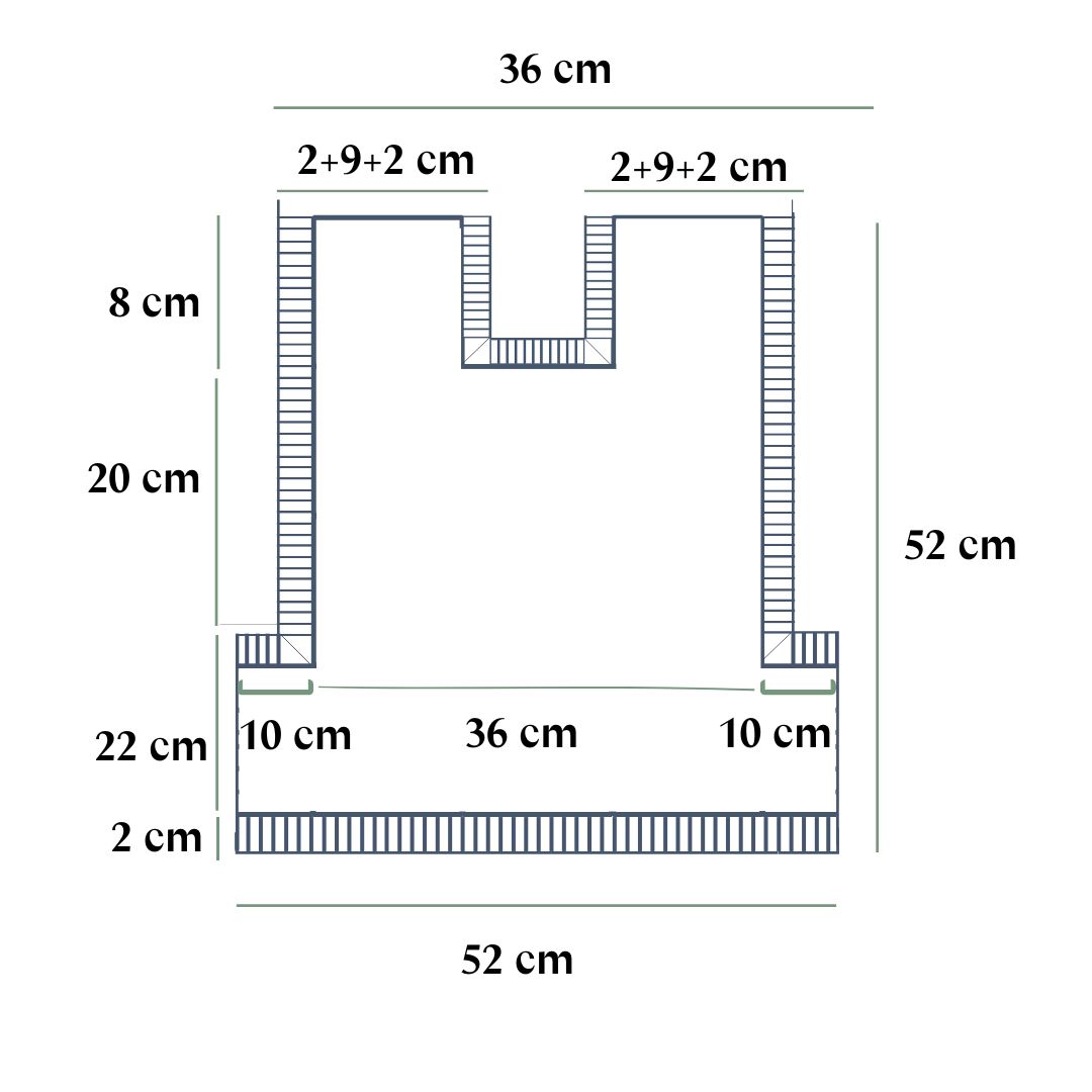 Framstycket kan delas in i tre olika partier enligt skiss nedan. Anpassa partierna i bredd och i längd för bästa passform. Kom ihåg att på bröstpartiet och axelpartiet måste du tänka in ca 1-2 cm till i bredd per sida för den ribbade kanten. Bålpartiet mäter 32 cm utan den ribbade kanten och 35 cm med kanterna.