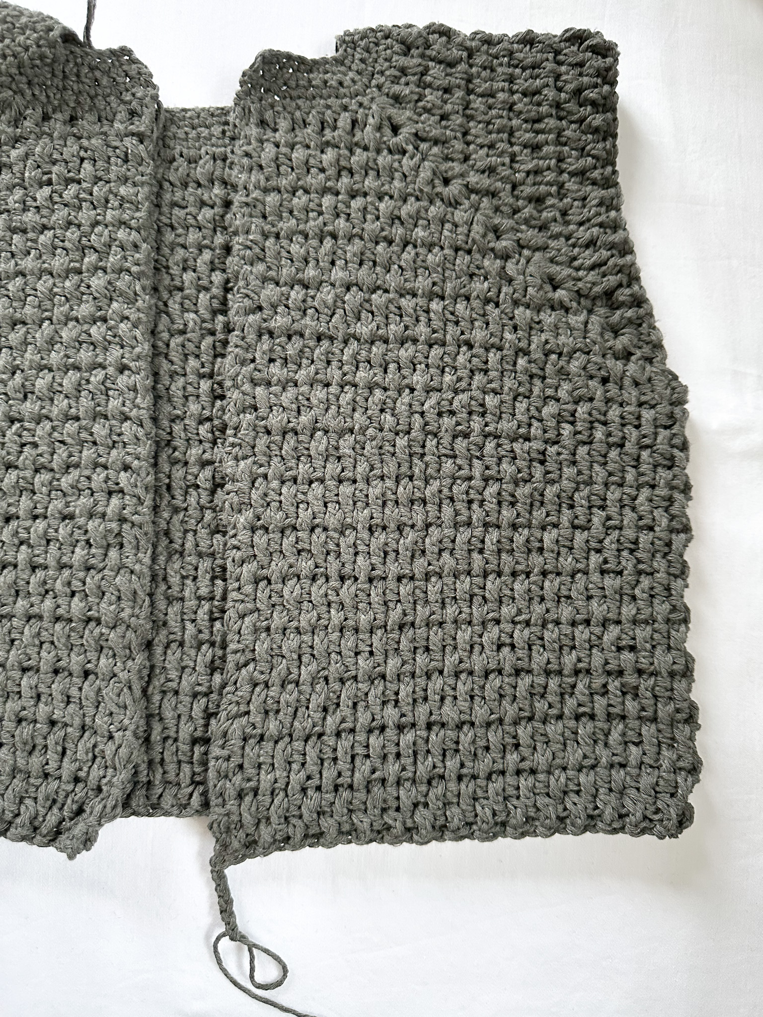 Fortsätt växla relifstolpe bak/fram på ryggsidan och virka sedan ihop hörn 3 och 4 på samma sätt som hört 1 och 2. Nu ska du ha 128 stolpar totalt på raden.