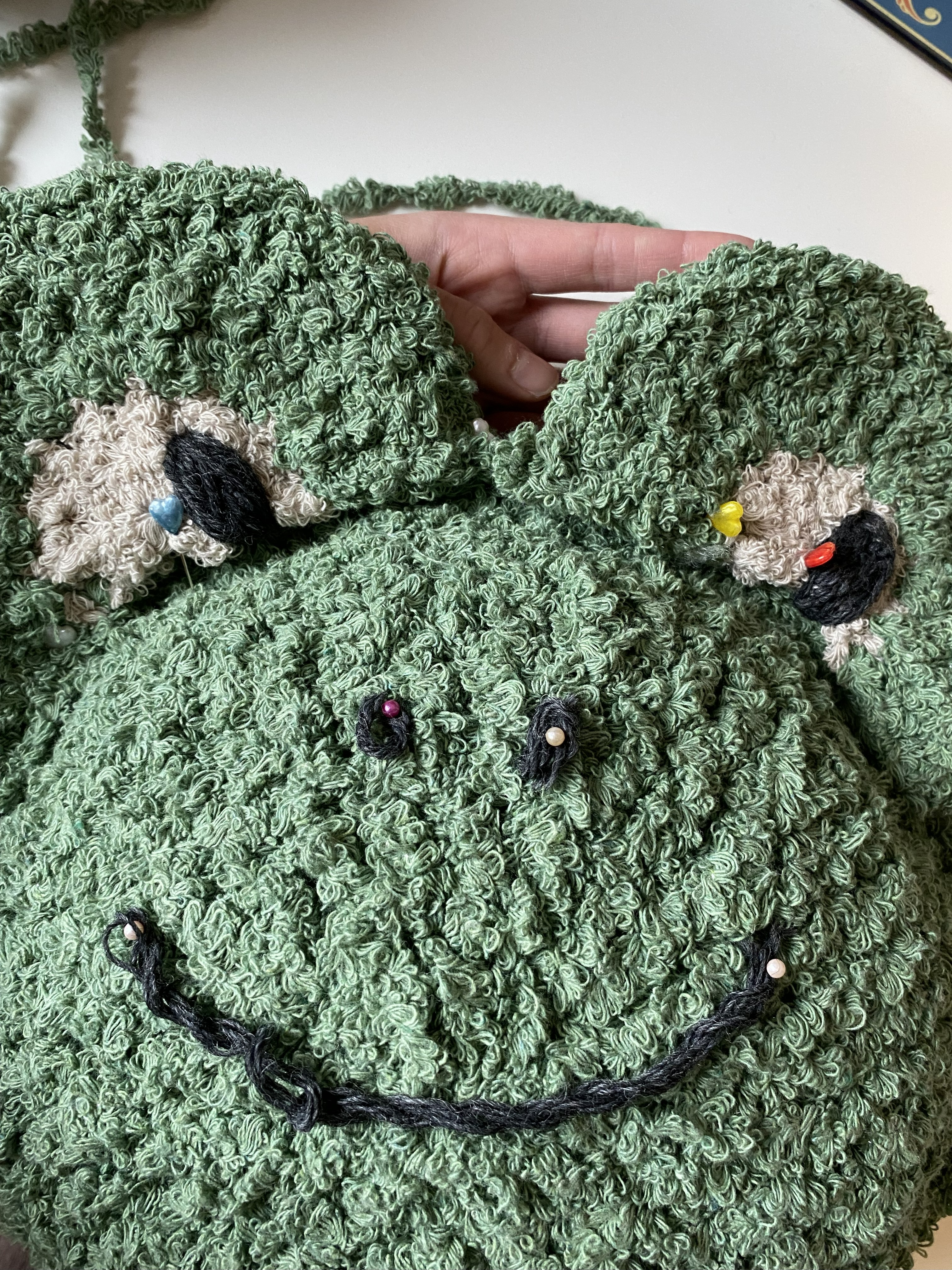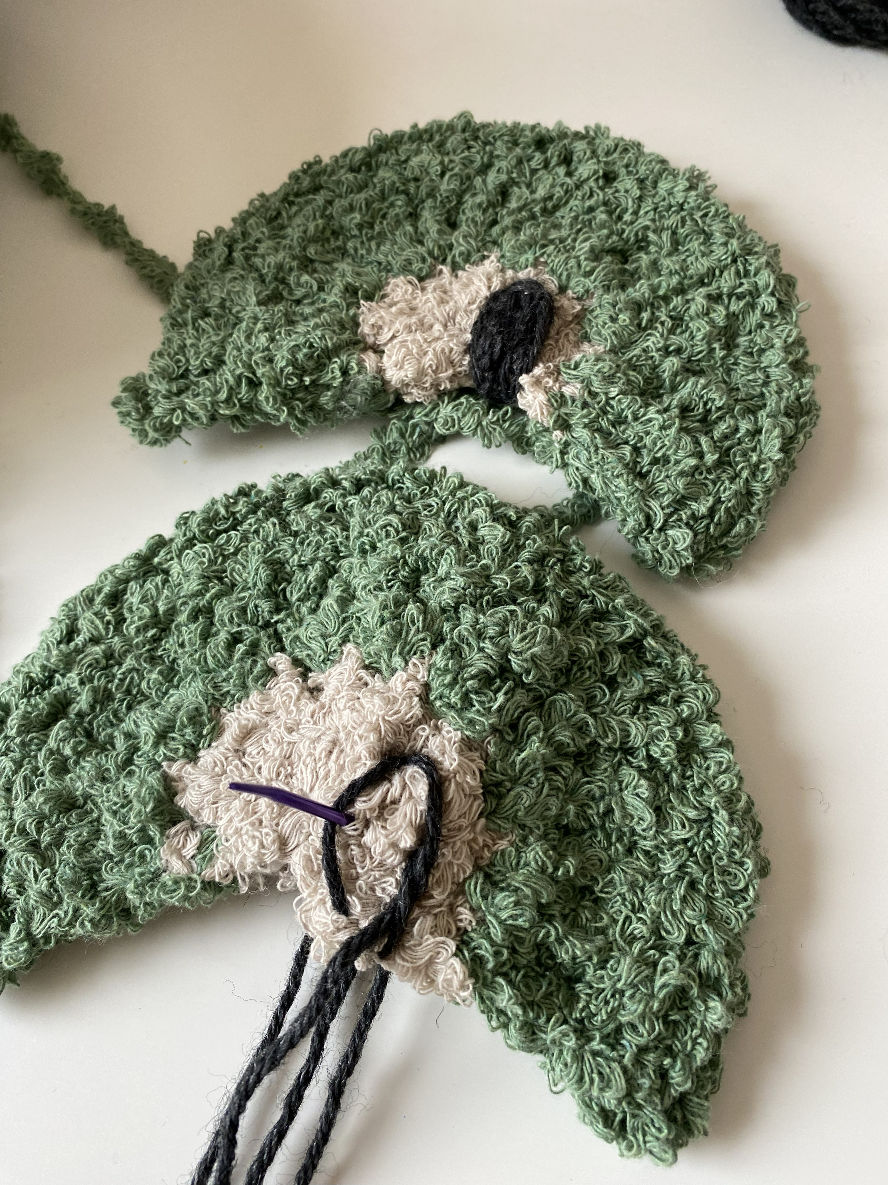 Öronen virkas i beige på första varvet och i andra varvet byter du till grön.