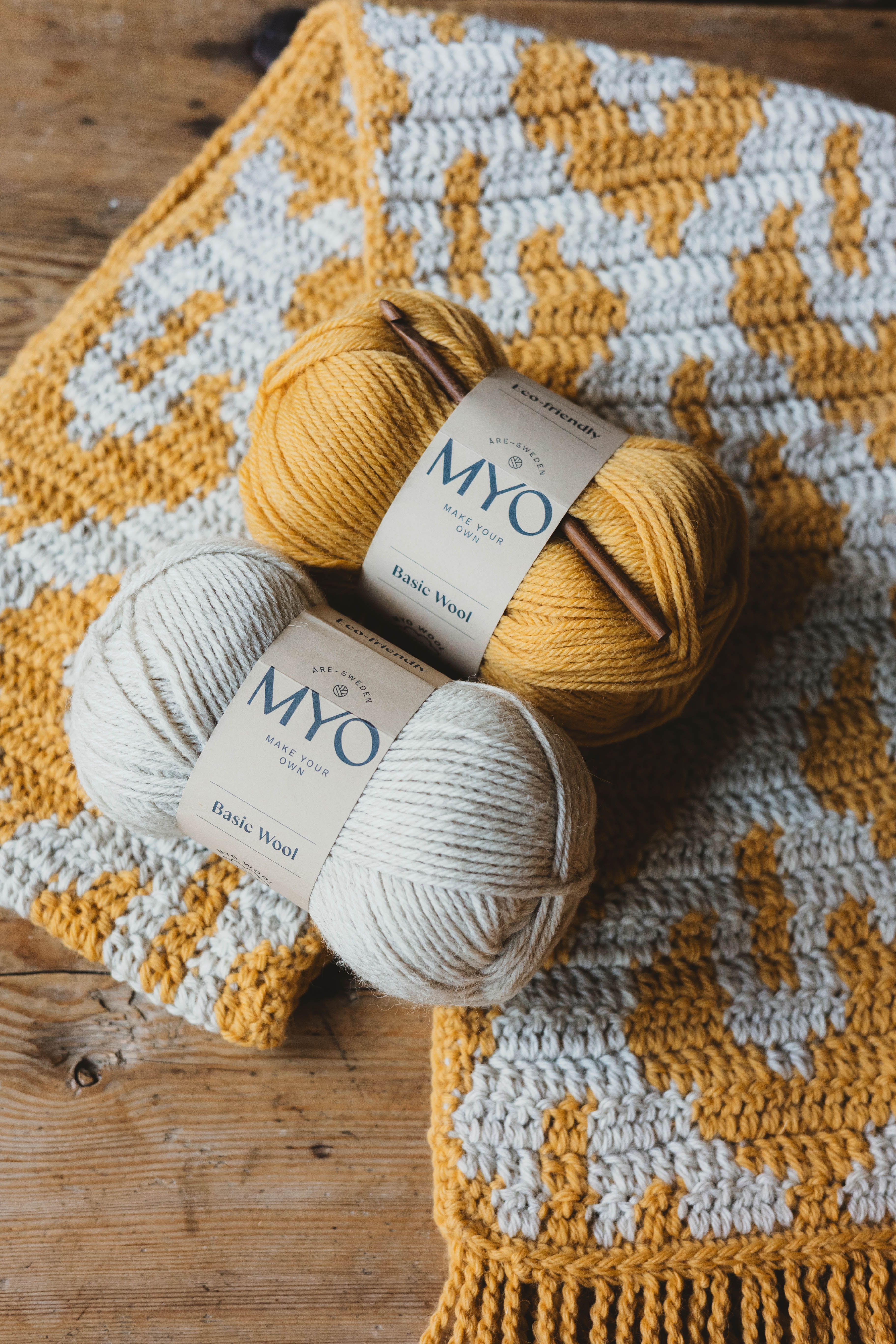 Här är ett mönster som passar för dig som vill testa att virka med två färger! Halsduken virkas platt och mönstret upprepas i tolv steg vilket kan vara utmärkt för en nybörjare som vill lära sig flerfärgsvirkning. Lika roligt kan det vara för en van virkare som önskar snabbt resultat men med ett mönster som ser mer avancerat ut än vad det är. Du kan välja att testa en teknik som ger din halsduk raka sidokanter – eller göra som du brukar. Du behöver MYO Basic Wool, virknål 6 mm, synål (för att sy in lösa trådar), sax och eventuellt 1-2 virkmarkörer.