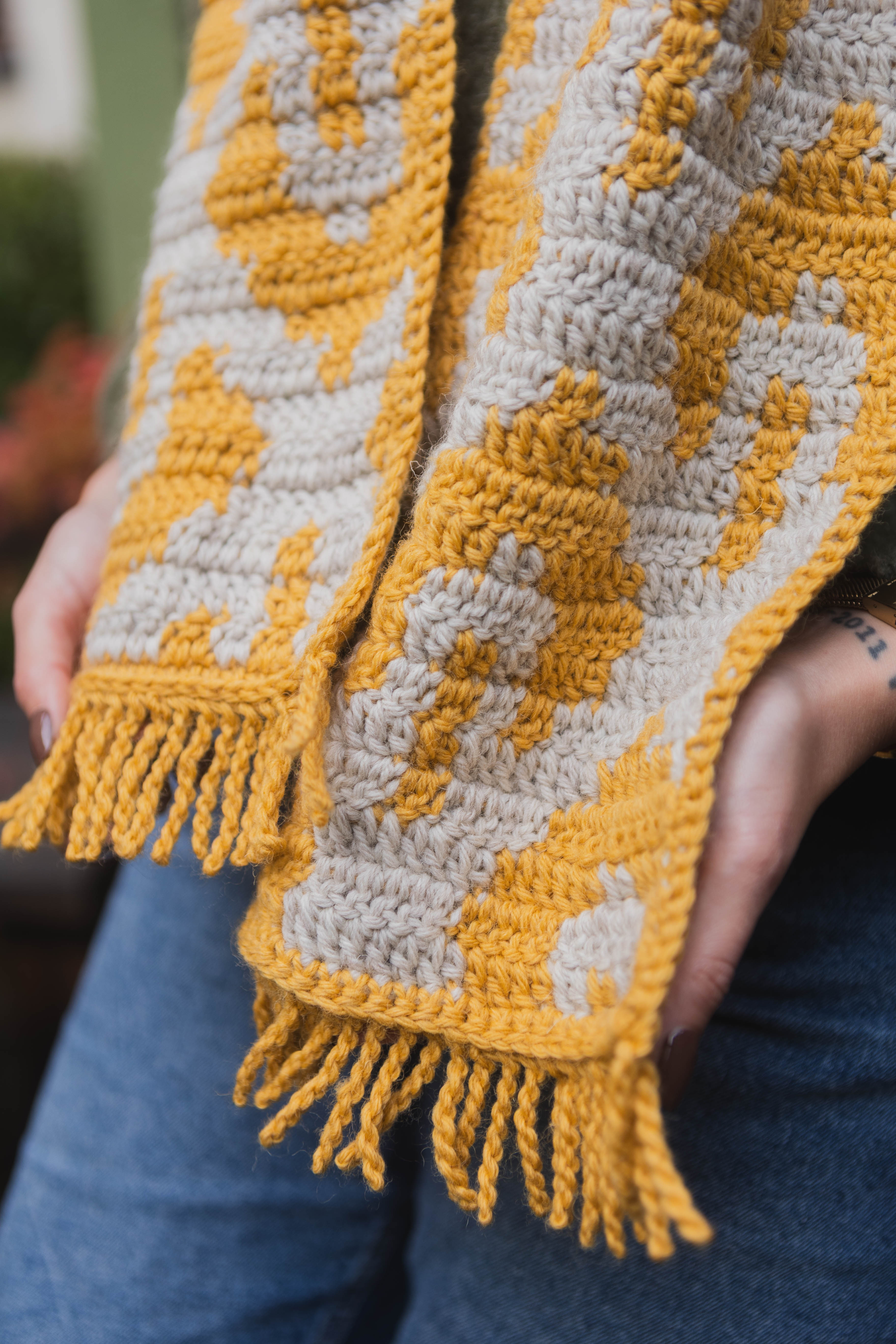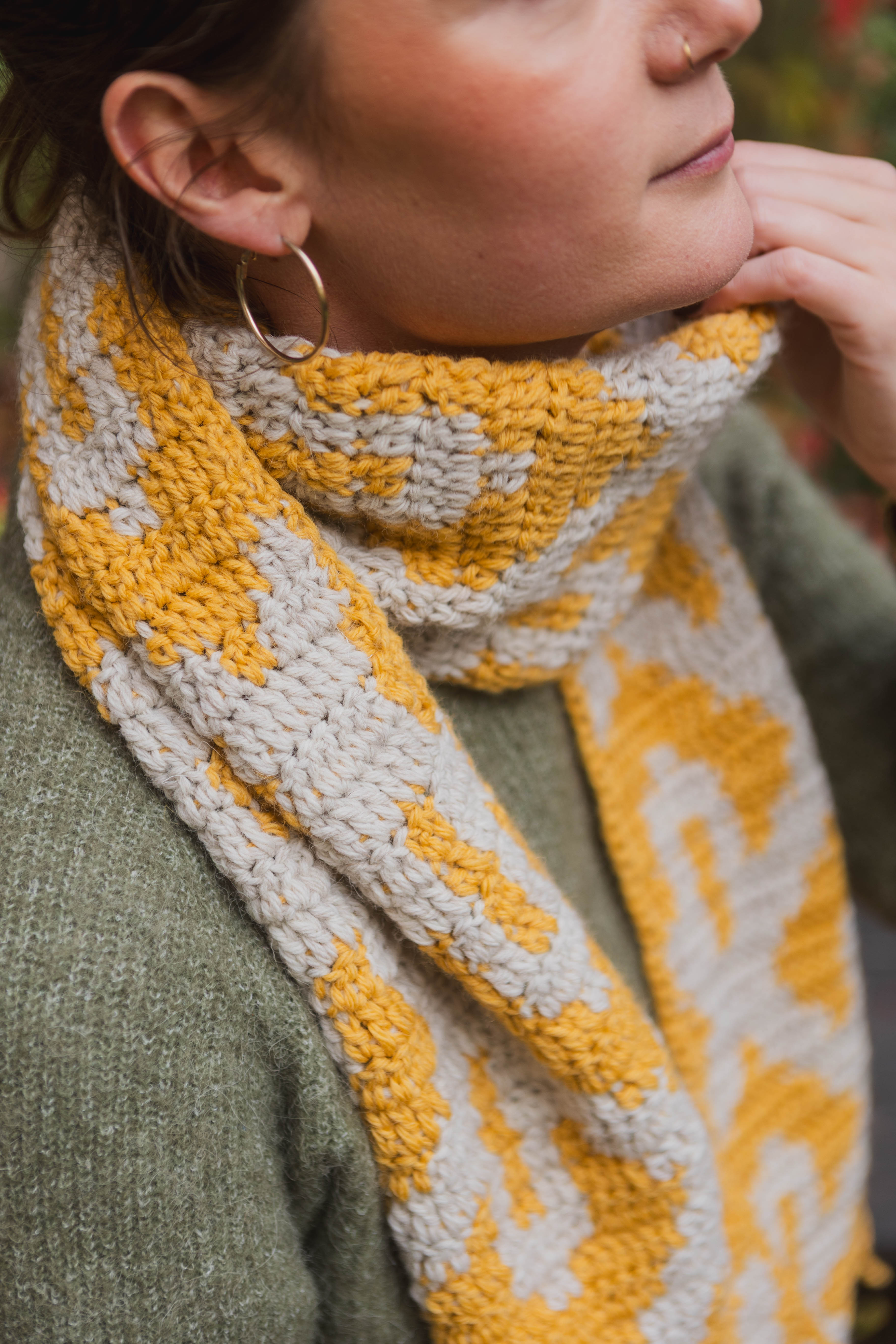 Garnåtgång: Ca 400 g för en halsduk med måtten ca 23 centimeter bred och 176 centimeter lång (utan fransar). Du behöver av bakgrundsfärgen (beige) än mönsterfärgen (rusty yellow).