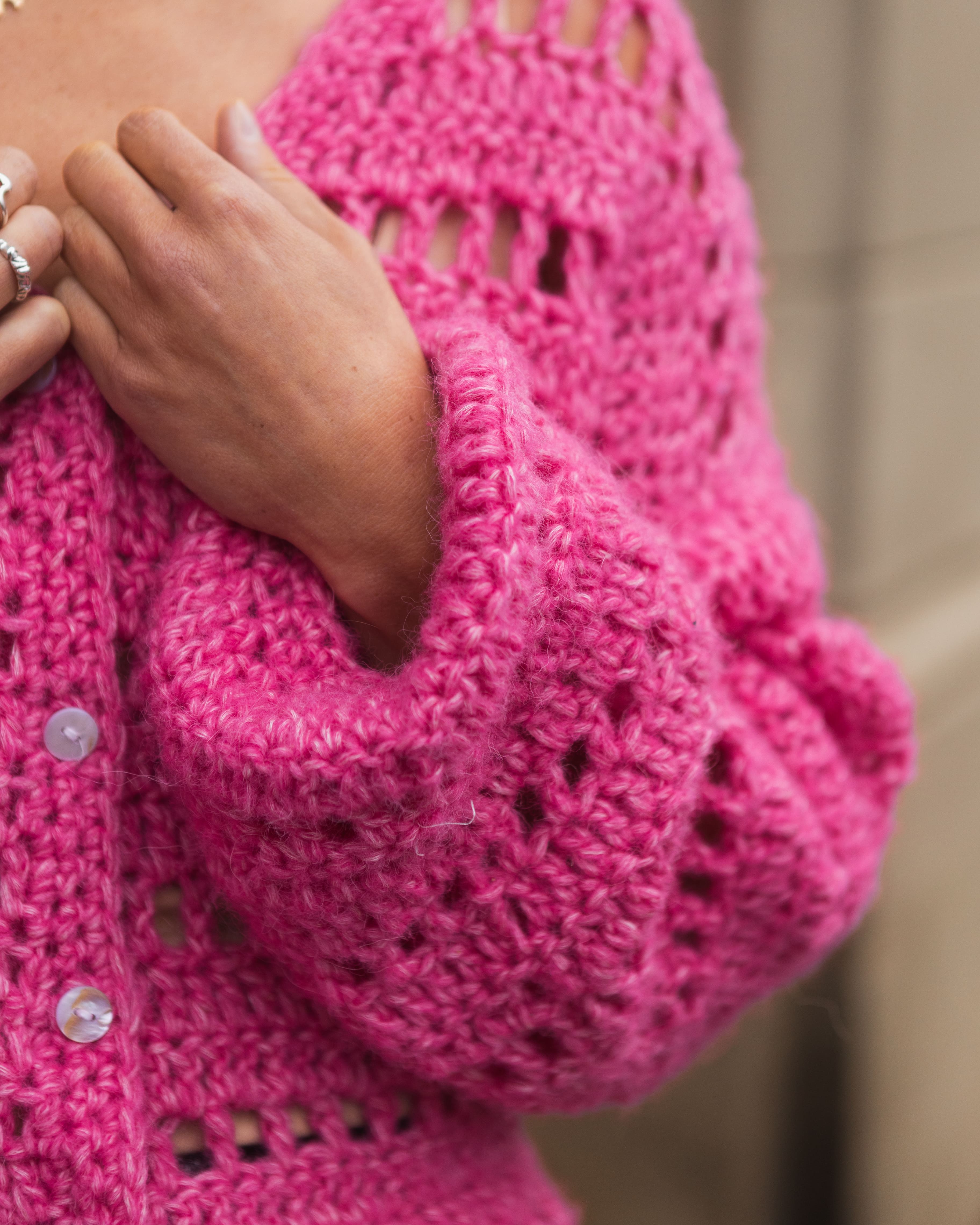 Denna kofta virkas i 3 delar som sedan virkas ihop innan ärmen virkas på tröjan. Den är nybörjarvänlig och så fin! Hoppas att du vill virka den med oss /Alma