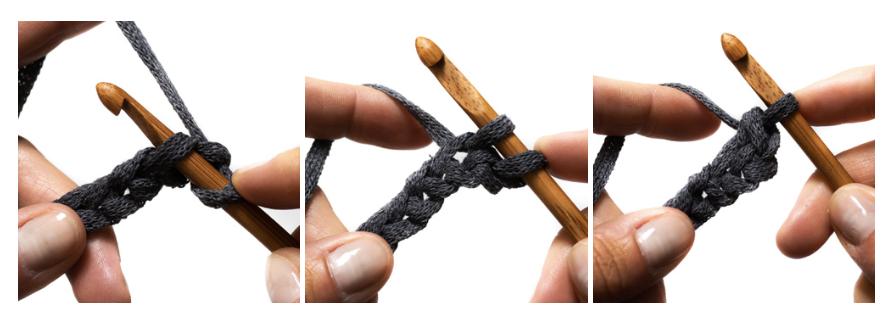 Istället för att gå under bakre raden, går du under hela raden och virkar maskan på samma sätt som ovan.