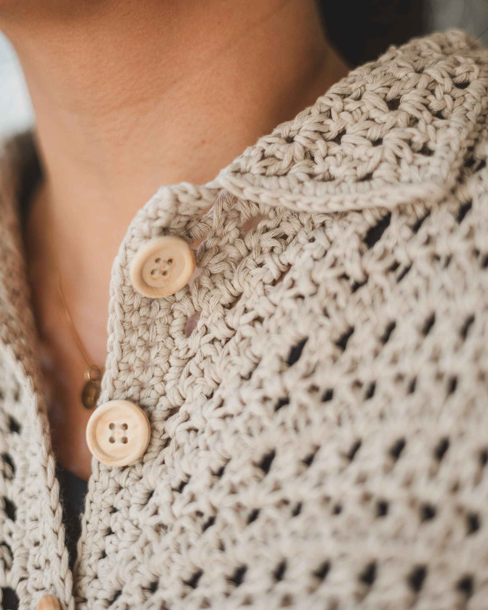 Kragen börjar virkas uppe i höger hörn på höger framstycke, precis till vänster om mitt-kanten med knapphålen.
