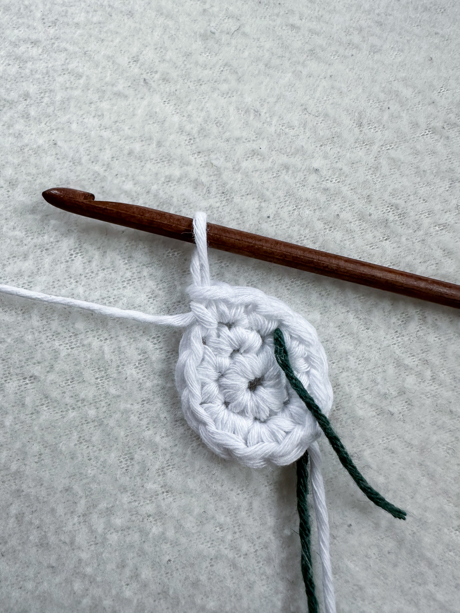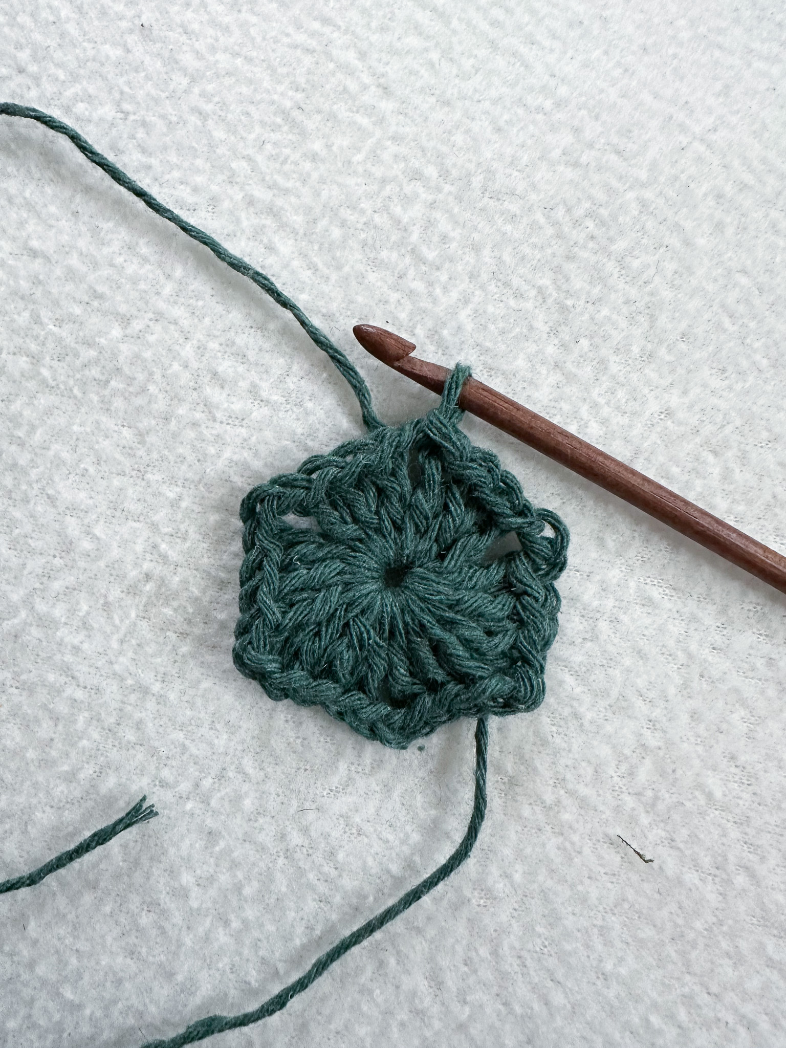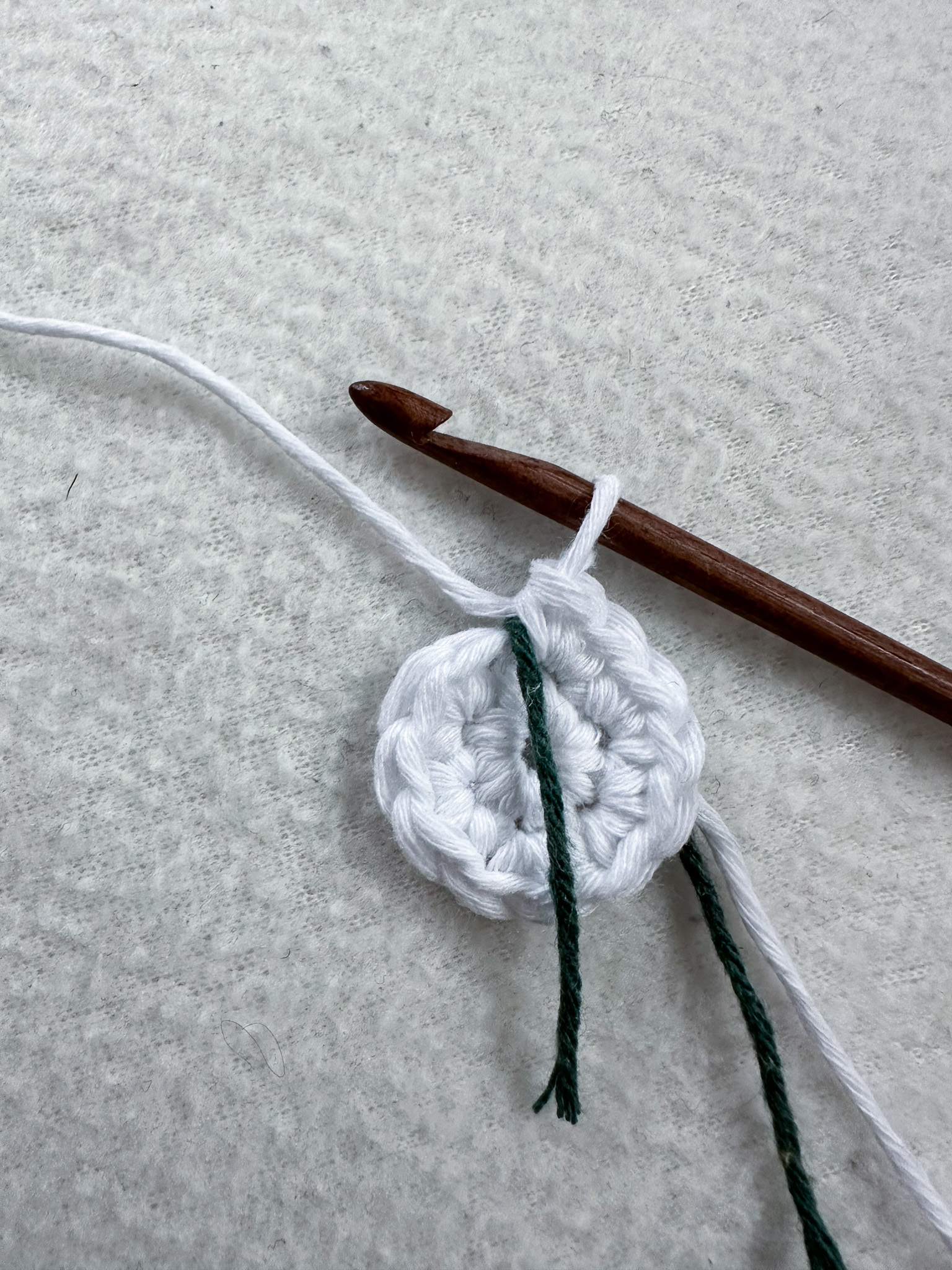 Varv 3: Virka en fast maska i första maskan. Sedan virkar du två fasta maskor i den andra maskan (en ökning). Upprepa detta (ökning i varannan maska) varvet ut. Totalt har du 9 maskor på varvet.