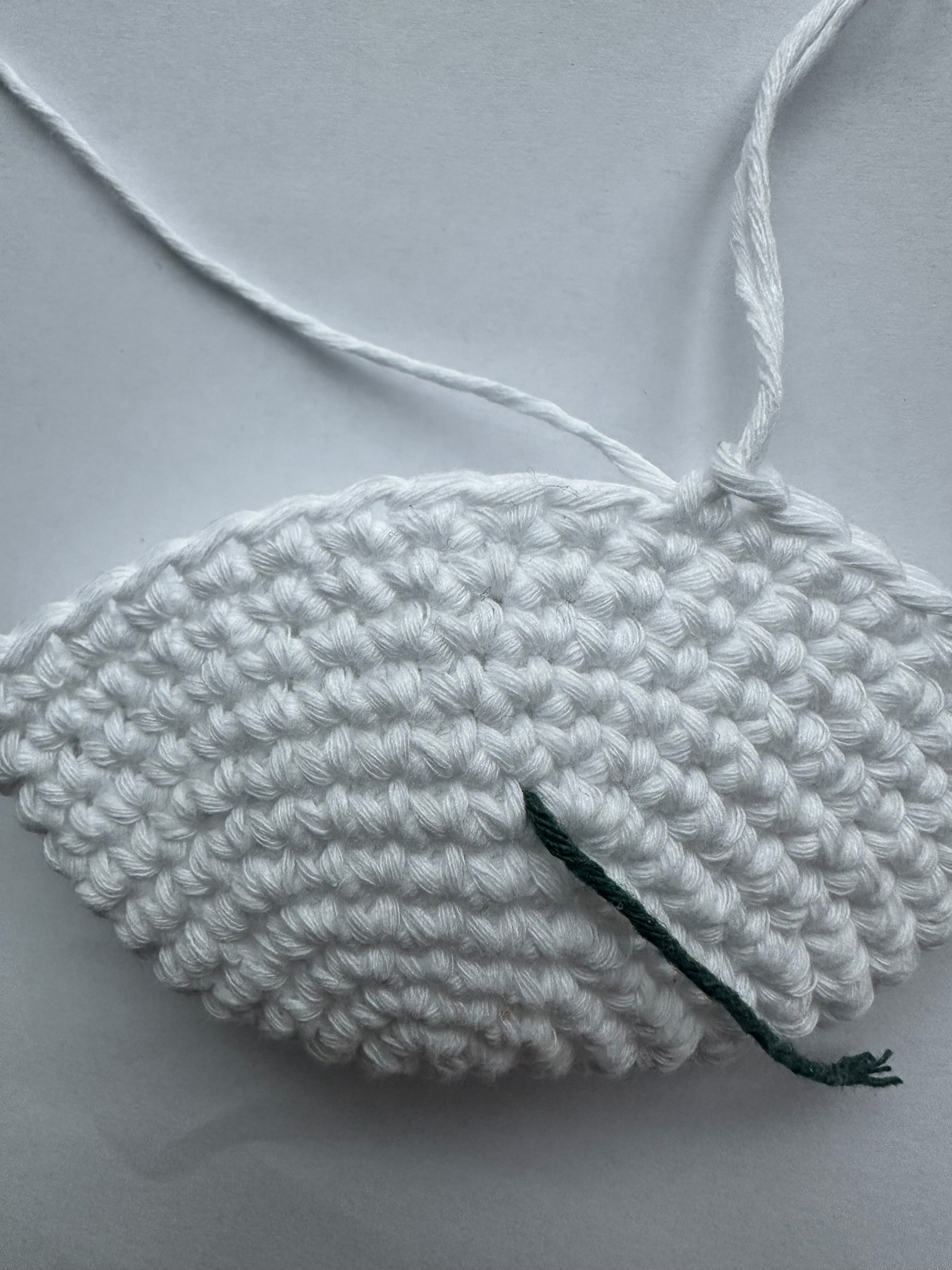 Lägg örat platt och virka ihop örat med 5 fasta maskor genom båda lagren. Avsluta och klipp av garnet, men spara en lång garnände.