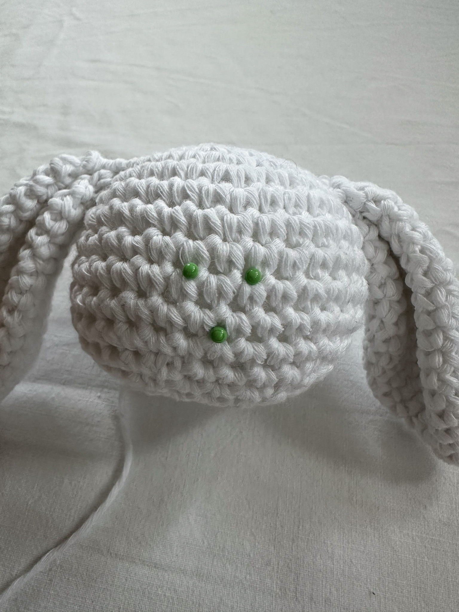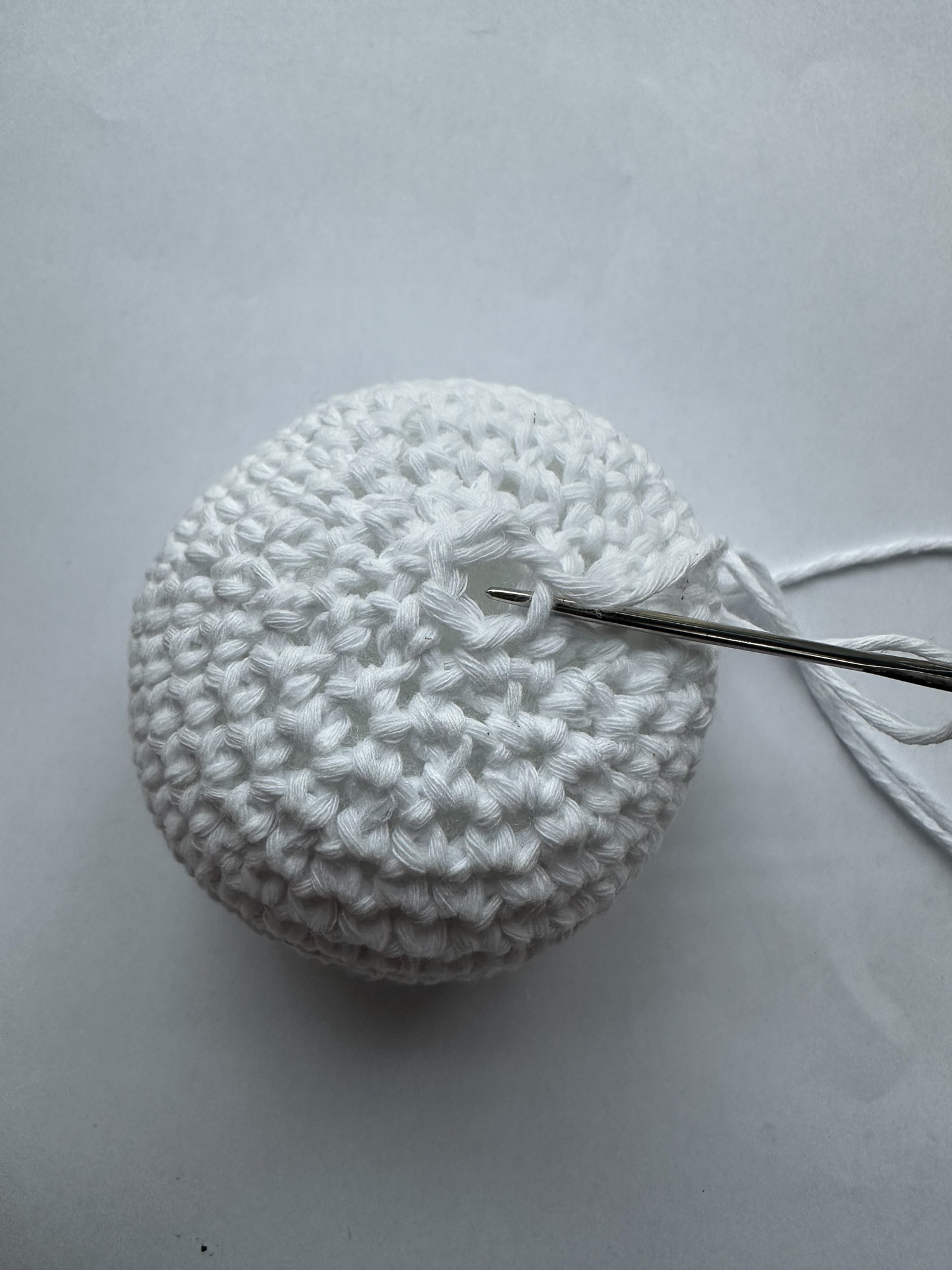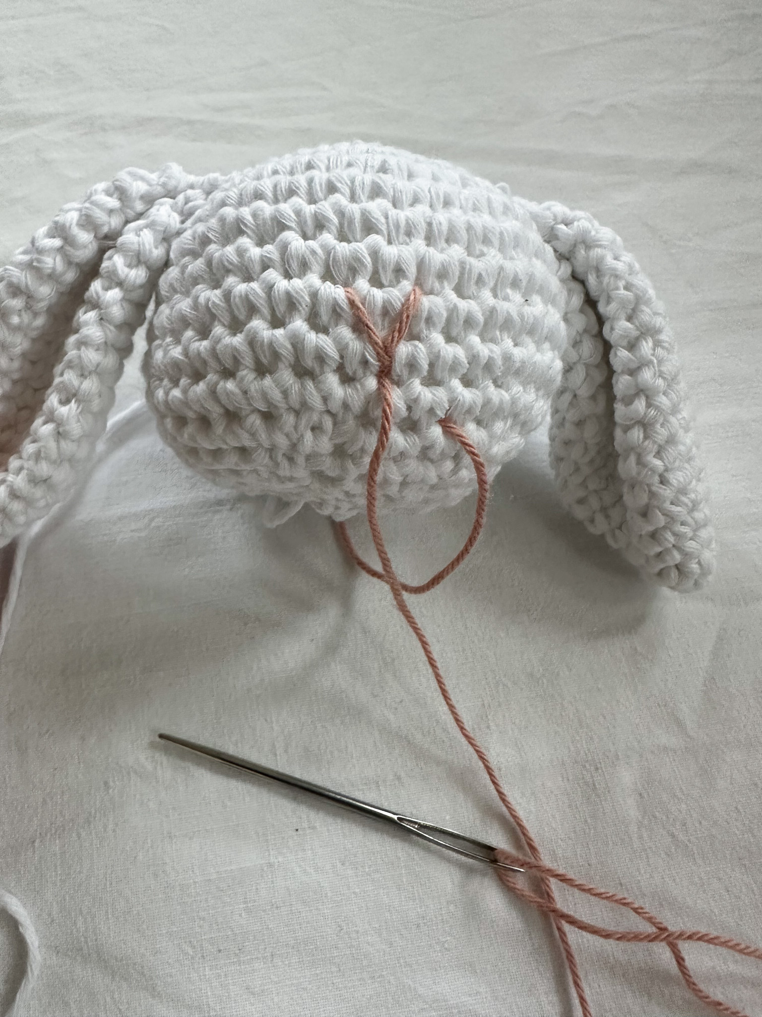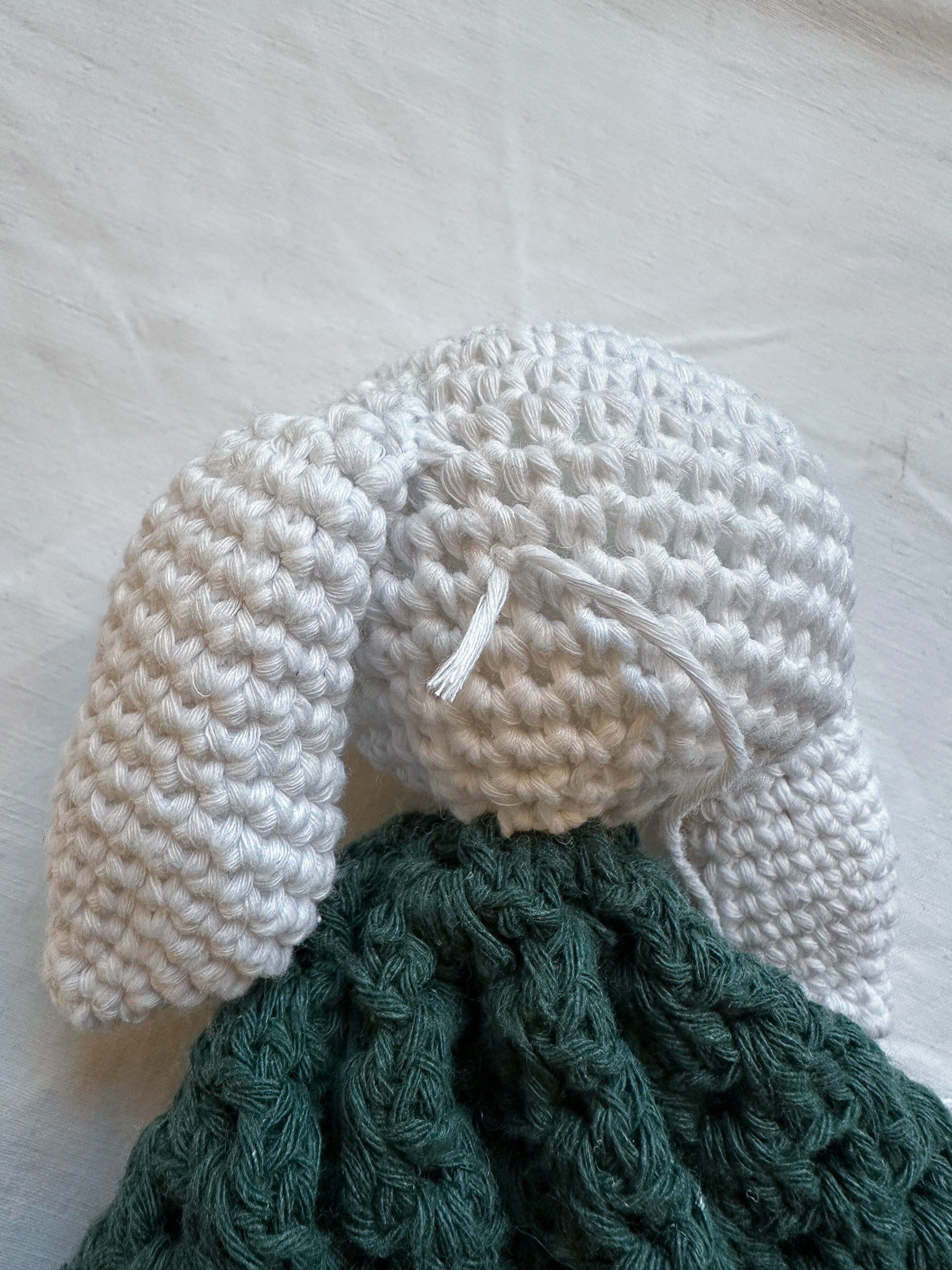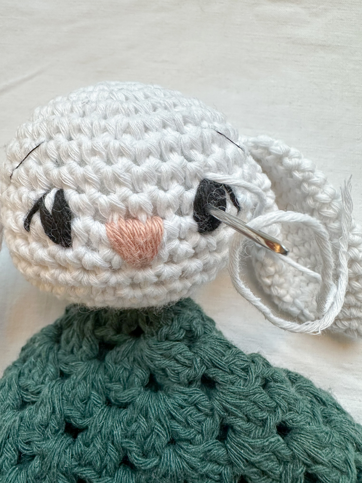 Nåla fast öronen ca 8 varv från MR på toppen av huvudet. Börja med att nåla fast båda öronen innan du syr fast dem. Kontrollera att öronen sitter lagom långt ner samt jämnt i bredd och höjd. När du är nöjd med placeringen, sy fast båda öronen. Kontrollera att vecket på öronen är riktade åt samma håll.