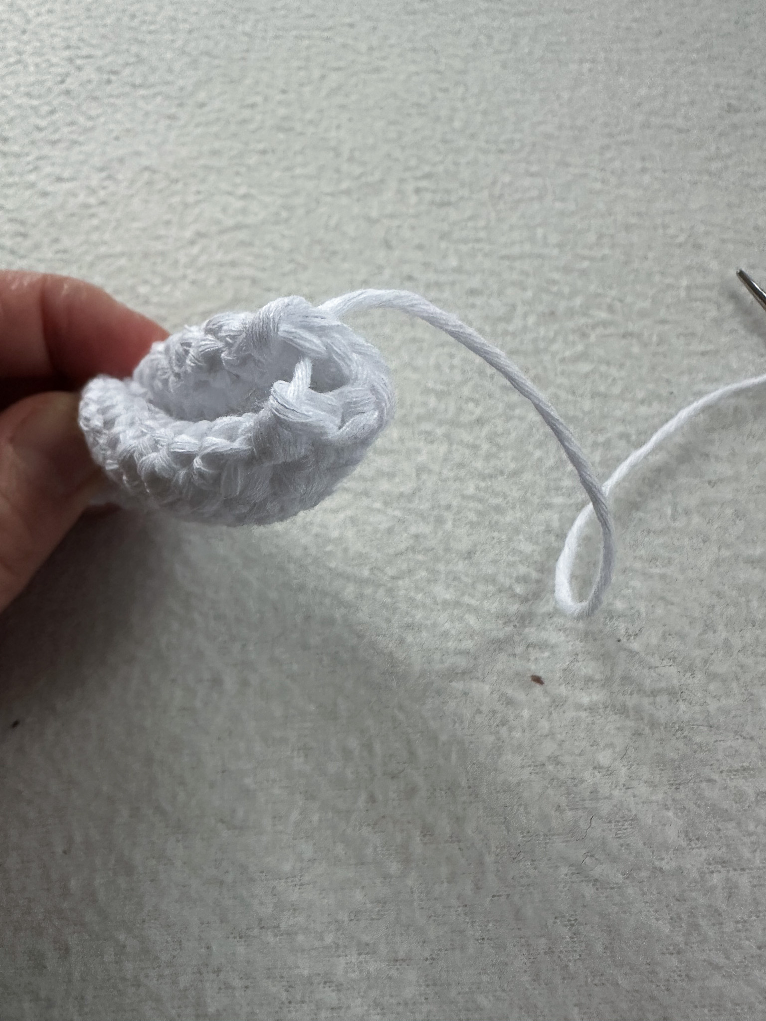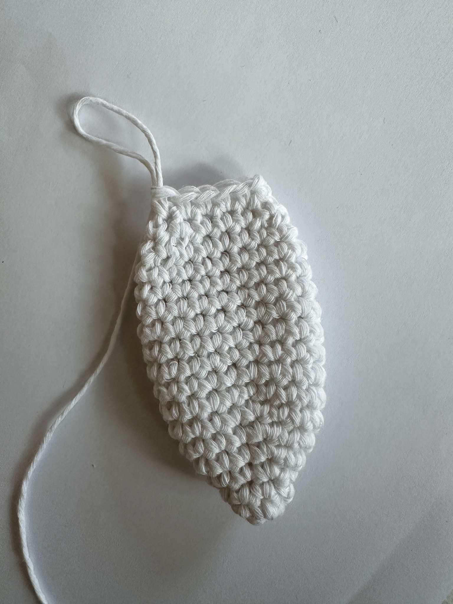 Varv 16: Virka en fast maska. Gör sen en minskning. Upprepa detta (minskning i var annan maska) varvet ut. Totalt har du 12 maskor på varvet.