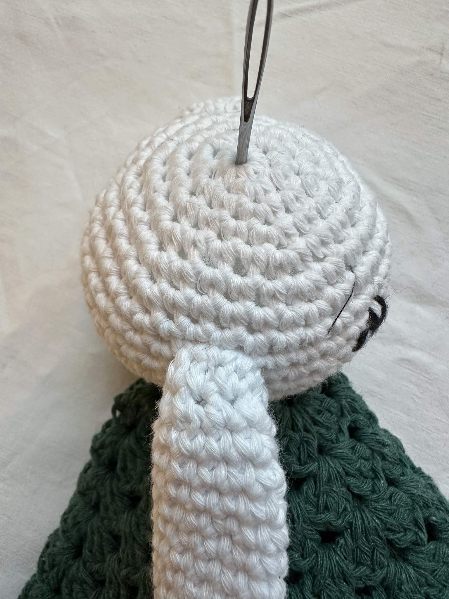 Sy fast huvudet mitt på snuttefilten med den långa garnänden från huvudet. Om du använder olika färger på huvud och snuttefilt, tänk på att inte gå igenom med tråden genom hela filten så att den färgen syns på undersidan av filten. Stick in nålen med tråden genom huvudet, knyt några hårda knutar på baksidan, klipp sedan av tråden och stoppa in knuten så den göms inne i huvudet.