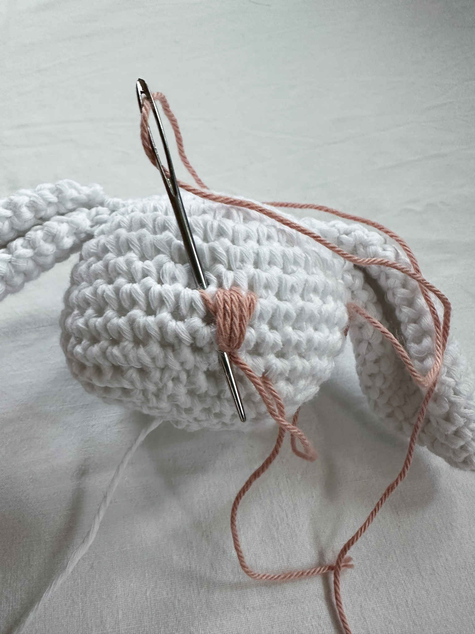 Börja med att sätta nålar i hörnen där du vill ha nosen, i en form av en triangel. Nålen längst ner placeras centrerat mellan öronen under varv 9. De två övre nålarna fästs över rad 7 med ca 2 fm i bredd. Brodera nosen mellan nålarna med en bit rosa garn.