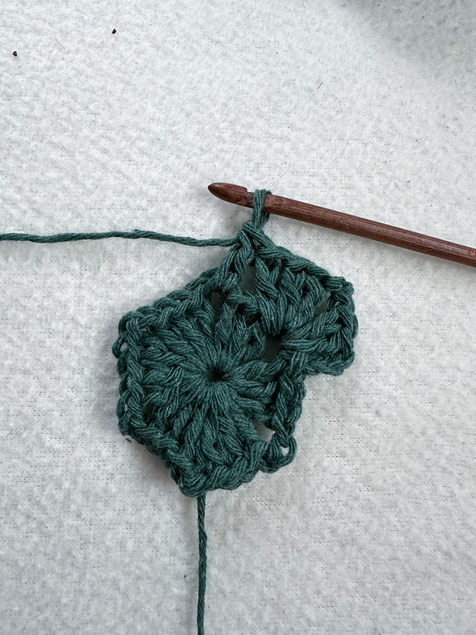Varv 1: 3 lm (ersätter 1 st), 2 st, 2 lm, 3 st, allt i lm-bågen (detta är det första hörnet), *3 st, 2 lm* x5, avsluta med 1 sm i den 3:e lm i början på varvet. Det skall vara 6 stolpgrupper med 3 stolpar i varje grupp på detta varv.