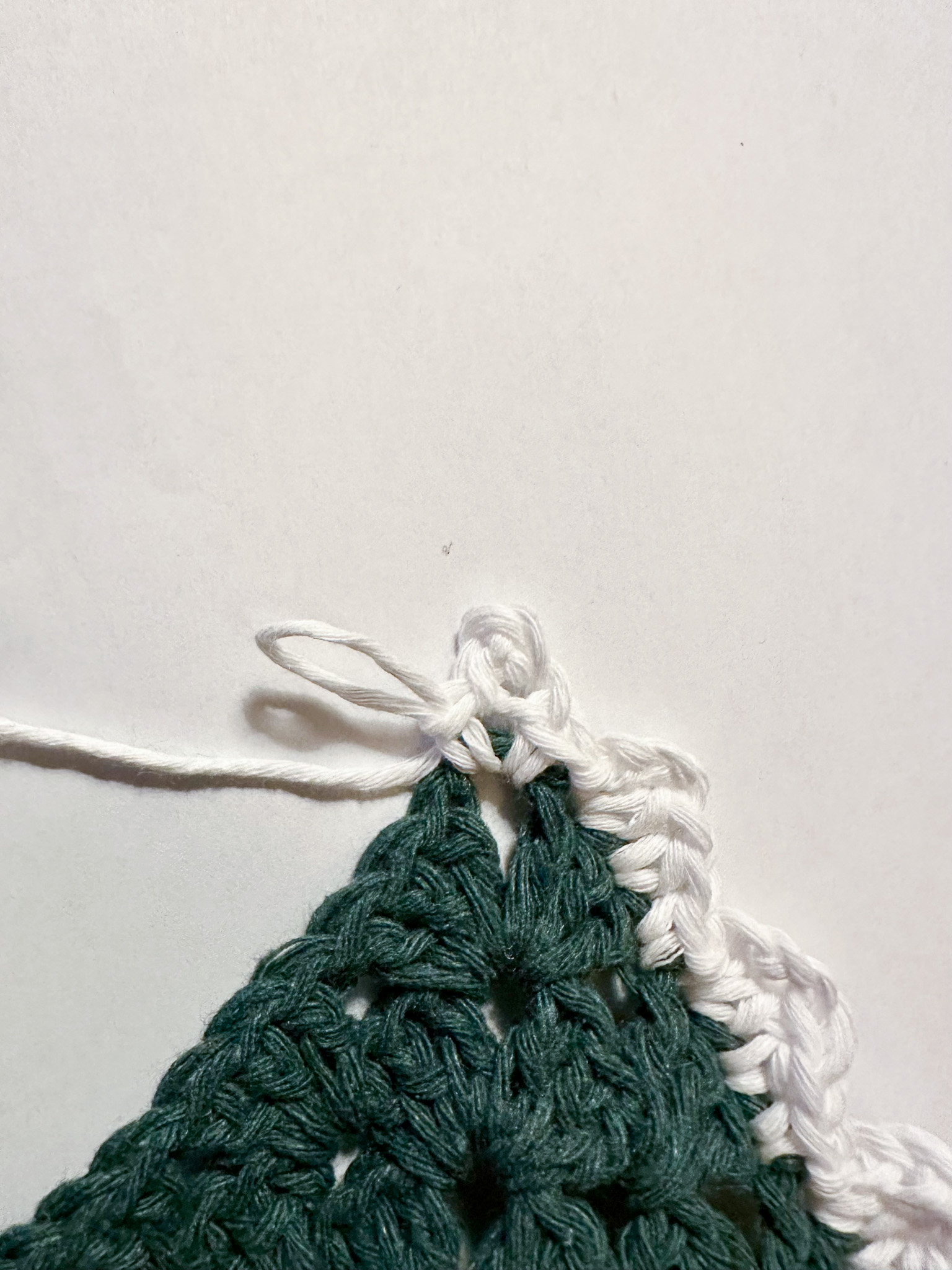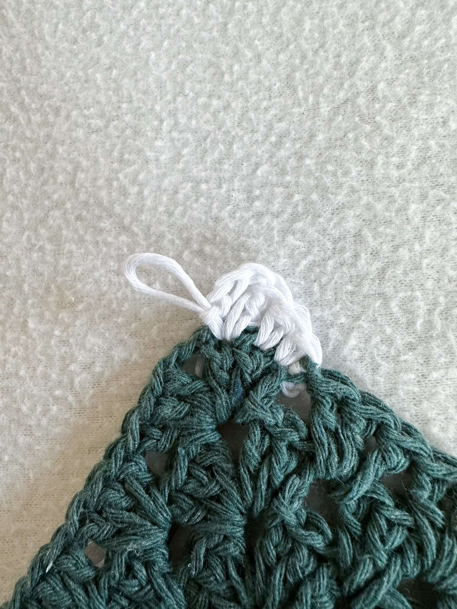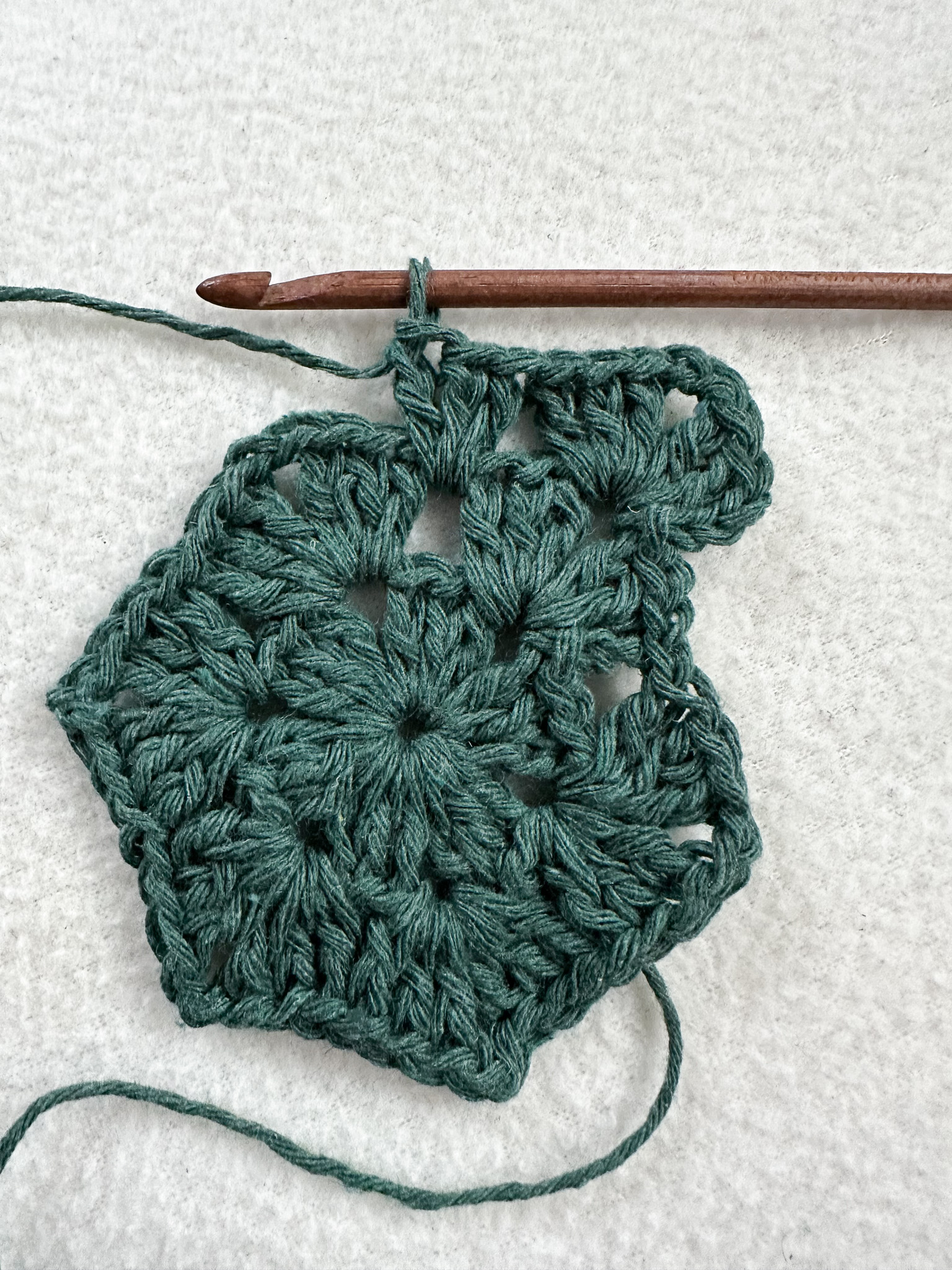 Virka sedan nästa hörn på samma sätt som första och fortsätt på samma sätt. Hörnen virkas alltså med tre stolpar, två luftmaskor och tre stolpar i samma hål. Mellan hörnen virkar du tre stolpar (en stolpgrupp). Avsluta med en smygmaska i tredje luftmaskan från start. Det skall vara 18 stolpgrupper med 3 stolpar i varje grupp på detta varv.