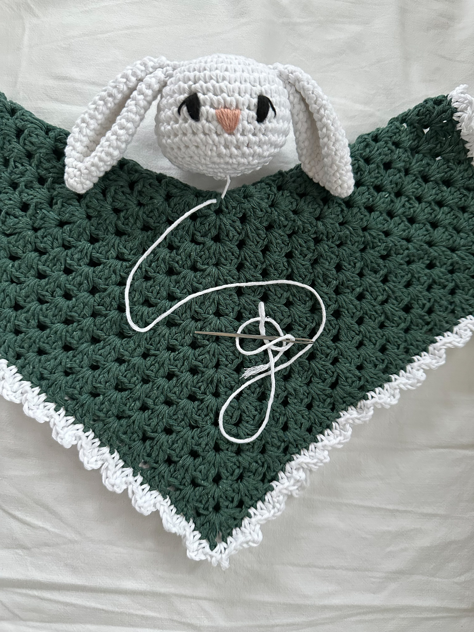 Upprepa hörn och sidor runt hela snuttefilten tills du kommer fram till starten på kanten. Klipp av garnet och fäst trådarna.