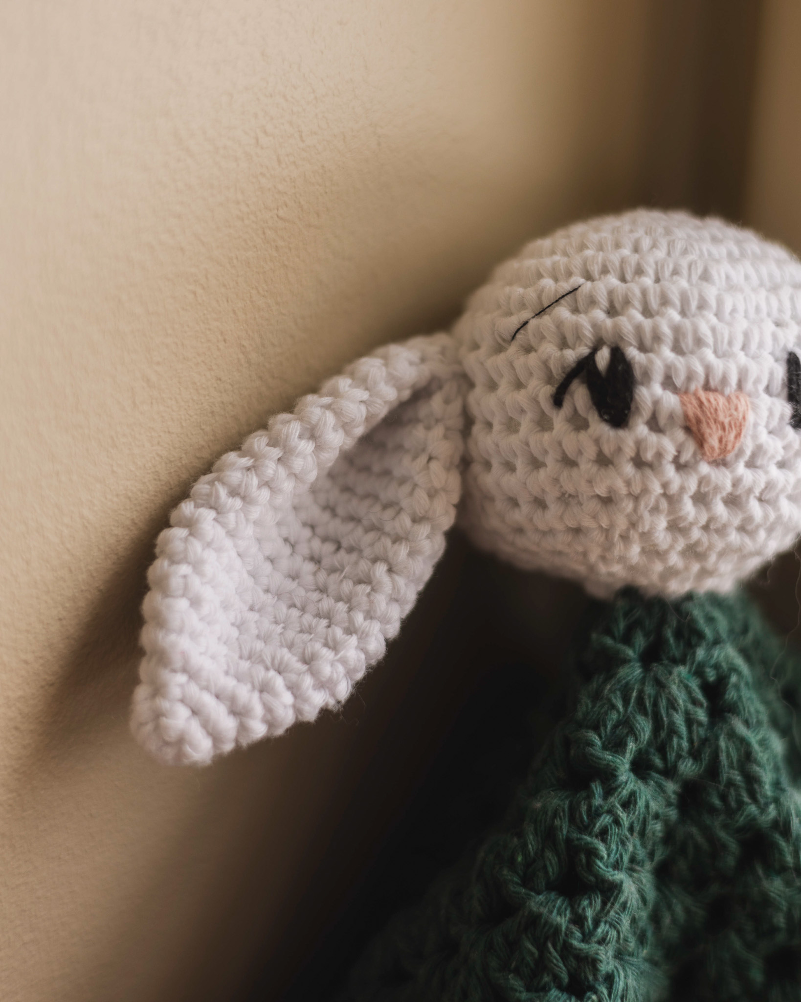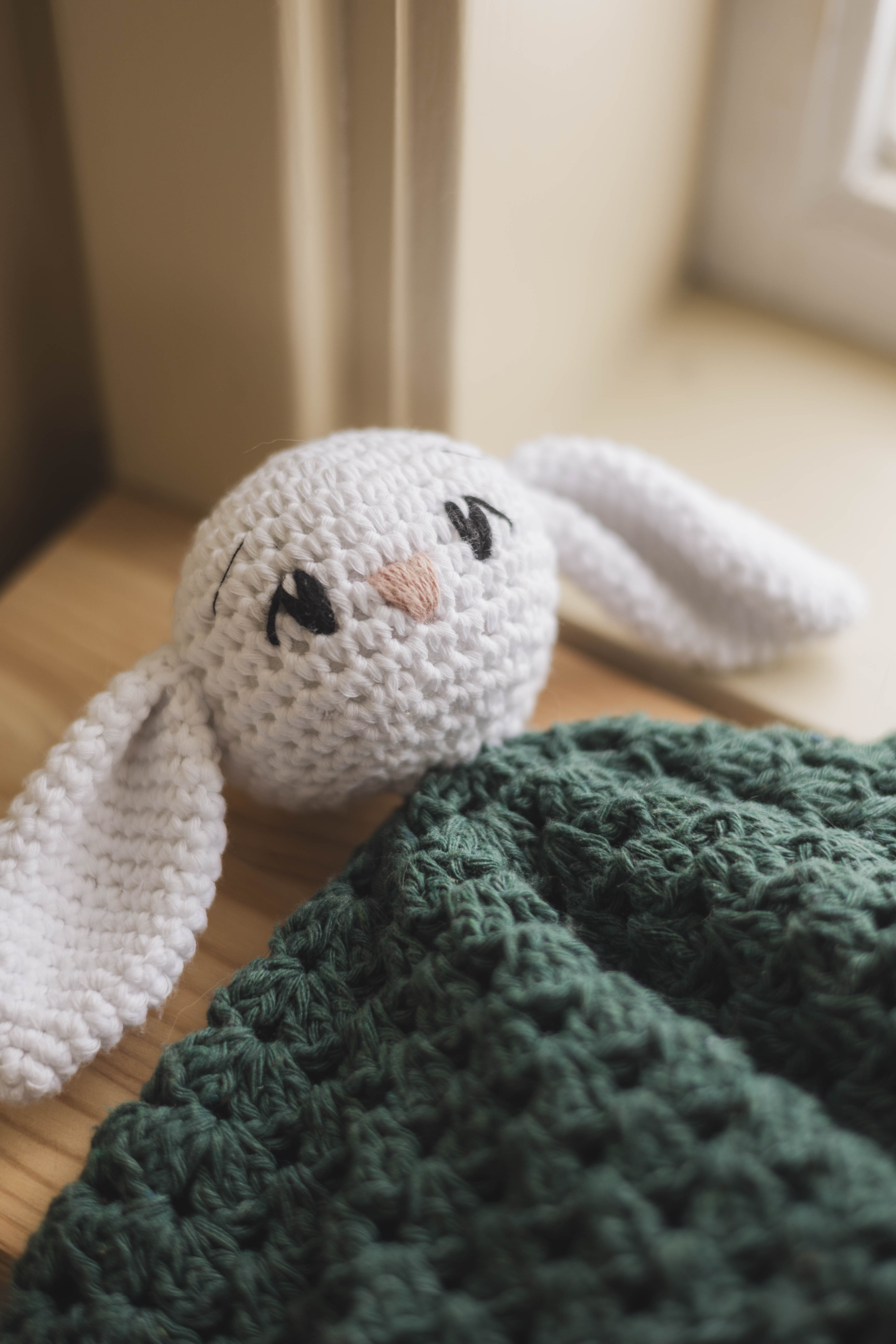 Denna kaninsnuttefilt är ett enkelt och roligt projekt som passar nybörjaren då man bara använder vanliga tekniker såsom fasta maskor och stolpar. Den virkas i det mjuka och tvättbara bomullsgarnet cotton cloud. En perfekt gåva till en liten nyfödd eller varför inte till blivande mamma och pappa på en babyshower. Den kan enkelt anpassas med de färger du önskar och vilket ansiktsuttryck och typ av ögon du vill att din kanin har. Du behöver garnetCotton Cloud ochvirknål 3,5 mm (om du vill kan du använda 4 mm till filten). Du behöver även stoppning/fyllnadsvadd till huvudet, nål så att du kan brodera ögon och nos samt lite garn i svart och rosa till ögon och nos. Det är fint att använda sytråd för att brodera ögonbryn med.