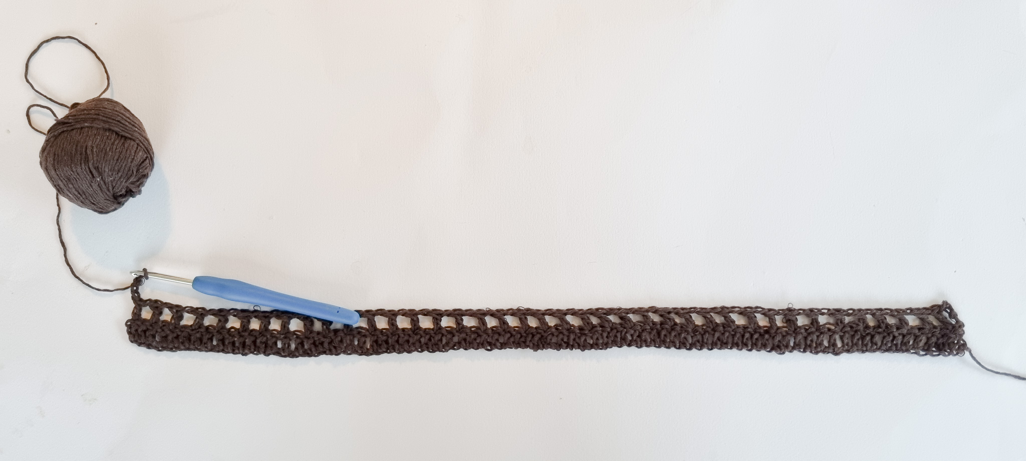 Rad 2: Gör 1 st i 2:a m. Virka 1 lm och hoppas över 1 m. 1 st i följande m. Repetera mönstret (1 lm, hoppas över 1 m, 1 st i följande m) raden till slut. Avsluta med 1 st i 3:e lm från f.g rad. 3 lm och vänd. Totalt 40 st (medräknat lm i början av raden).