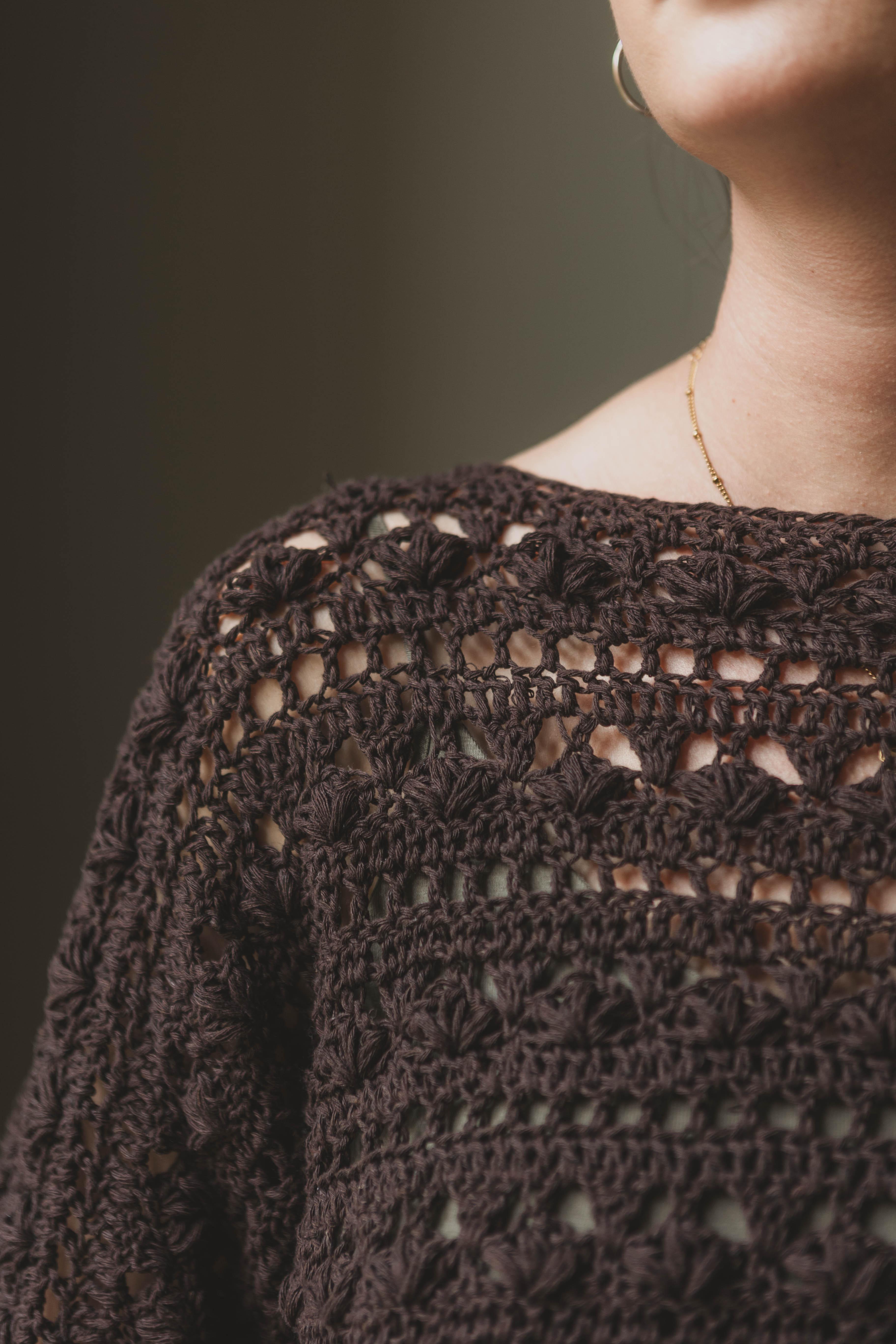 Denna top passar till många olika tillställningar. Det är enkelt att anpassa storleken efter egna mått genom anpassa de första luftmaskorna till jämnt fördelat med 6. Mönstret består även av förslag för storlek M (S, L, XL). Blusen består av 5 rader som repeteras under processens gång så det är ett relativt enkelt projekt. Du behöver MYO Cotton Cloud (vi har använt Dark Brown), virknål 4 mm, synål, markörer, sax, måttband.
