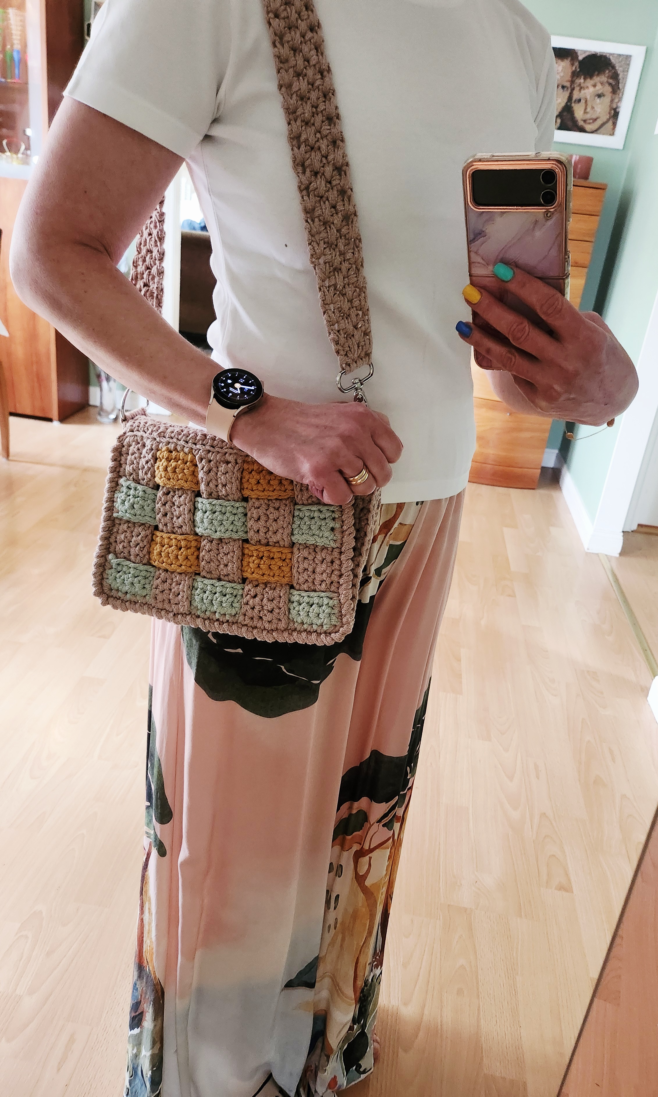Väskan virkas först genom att virka remsor i olika längder och tjocklekar som sedan flätas och virkas ihop i kanten. Sedan fortsätter du virka på bakstycket och mittstycket. Sist virkas det ihop med den flätade framsidan. Sidorna på väskan virkas som separata paneler som sedan virkas ihop på sidorna av väskan. Lägg till en kant med krabbmaskor samt en axelrem och sen är väskan klar! Hoppas du vill testa på att göra din egna väska! Lycka till! /Johanna H