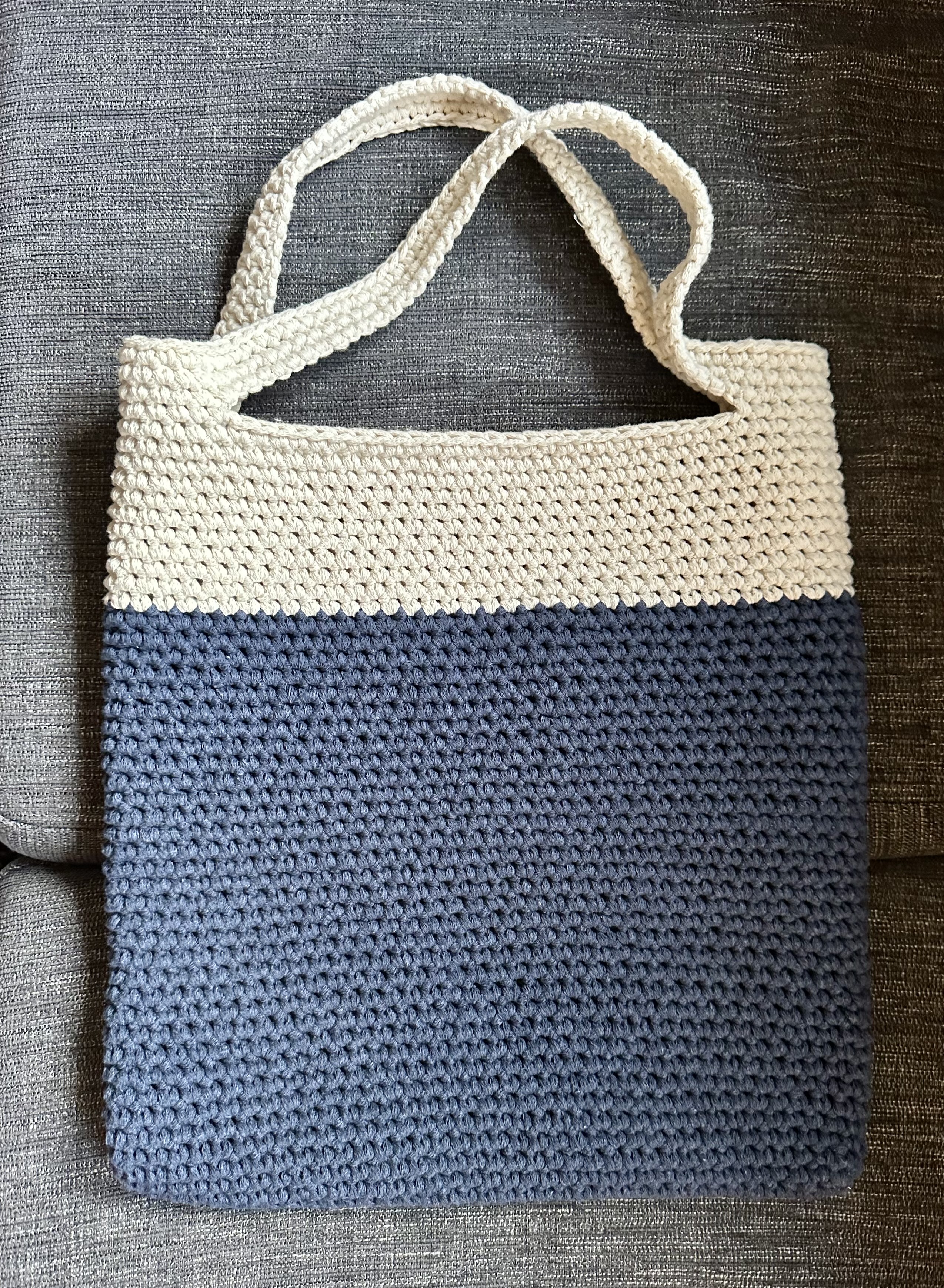 Upprepa varv 3 tills du är nöjd med höjden på väskan eller vill byta färg (väskan på bilderna virkades med 15 varv i blått och 27 varv i vitt, innan axelremmarna påbörjades).