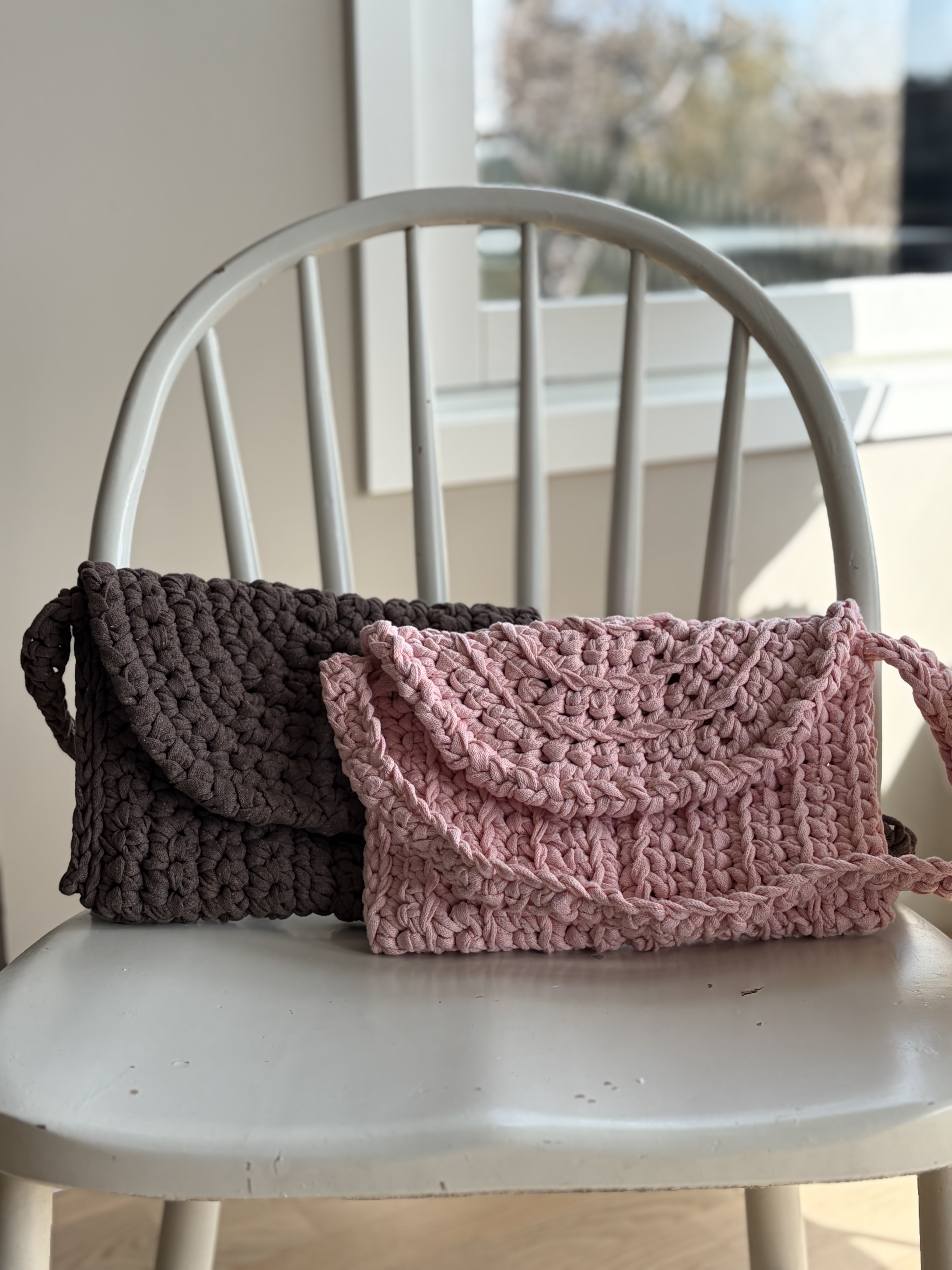 Väskan virkas i rader runt en kedja. I slutet viker vi väskan och virkar ihop den. Ett enkelt och relativt snabbt projekt! Sätt igång med din favoritfärg :) /Lizette